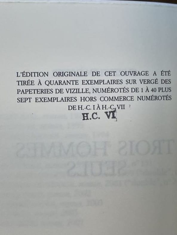 Edition originale. Tirage de tête : un des 40 exemplaires du tirage numéroté sur vergé de Vizille (seul papier) ; plus 7 hors-commerce. ''Marie m'invitait à passer quelques jours en Corse. Je pouvais venir avec qui je voulais. J'en ai donc parlé à Marc, que je fréquentais depuis trois mois sur un court de tennis, du côté de la porte de Clignancourt. Lui-même en a parlé à un type que je ne connaissais pas. Sur la banquette arrière, j’ai pu caser la chaise que Marie m’avait laissée en s’en allant, deux ans plus tôt, et qu’elle me demandait de lui rapporter. Après quoi, tous les trois, on s’est dit qu’on ferait connaissance en chemin, et on est partis.'' Très belle condition.