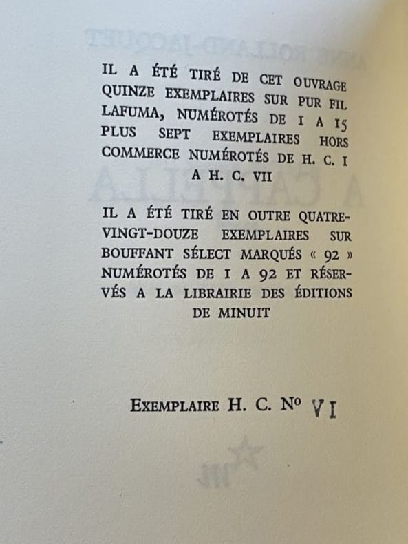 Editions de Minuit 1972 1 vol. broché in-12, broché, non coupé, 114 pp. Edition originale. Un des 22 exemplaires de tête numérotés sur pur fil Lafuma, et parmi ceux-ci l'un des 7 hors commerce (ex. n°VI), avec un envoi autographe signé de l'autrice à Henri Causse, directeur commercial des éditions de Minuit. En parfait état.