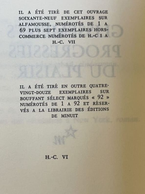 Paris, Les Editions de Minuit, 1974 (impr. 26 déc. 1973). Petit in-8, 221-(3) pp., broché, jaquette illustrée. Joint : le prospectus pour Projet pour une Révolution à New York.