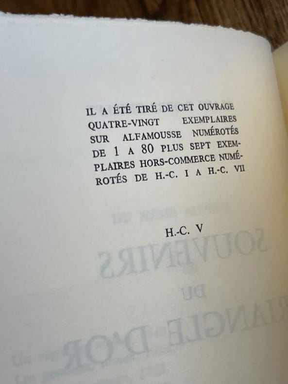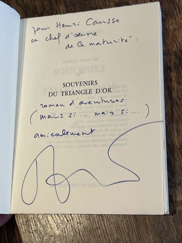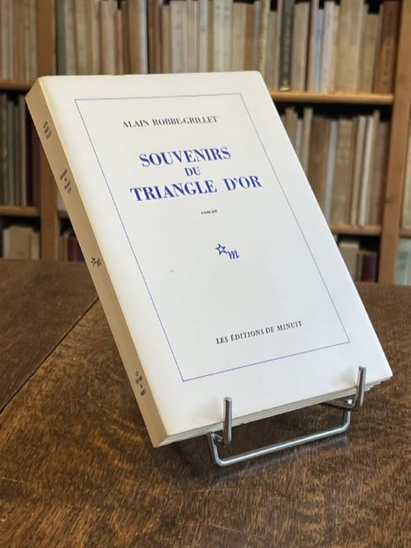 Paris Editions de Minuit 1978 1 vol. broché in-8, broché, 237 pp. Edition originale. Un des 87 exemplaires numérotés sur alfa mousse (seul tirage en grand papier), et parmi ceux-ci l'un des 7 hors commerce (ex. n° V), avec un amusant envoi autographe signé de l'auteur au directeur commercial des éditions de Minuit : "Pour Henri Causse, ce chef d'oeuvre de la maturité : [Souvenirs du triangle d'or] roman d'aventures (mais si... mais si...). amicalement". En parfait état.