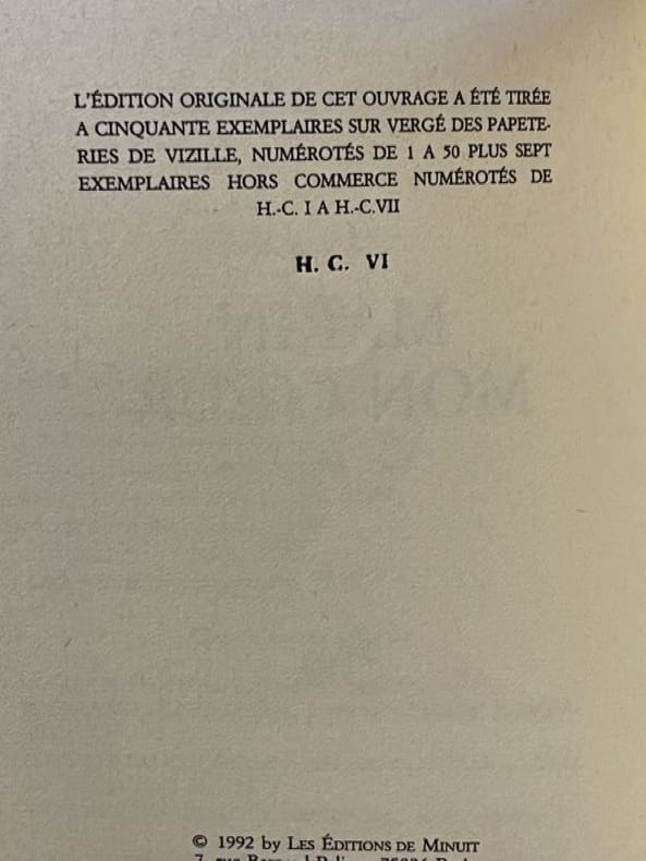 Paris Editions de Minuit 1992 1 vol. broché in-8, broché, non coupé, 90 pp. Edition originale. Un des 57 exemplaire sur vergé de Vizille (seul grand papier), et parmi ceux-ci l'un des 7 hors commerce (ex. n°VI), en parfait état.