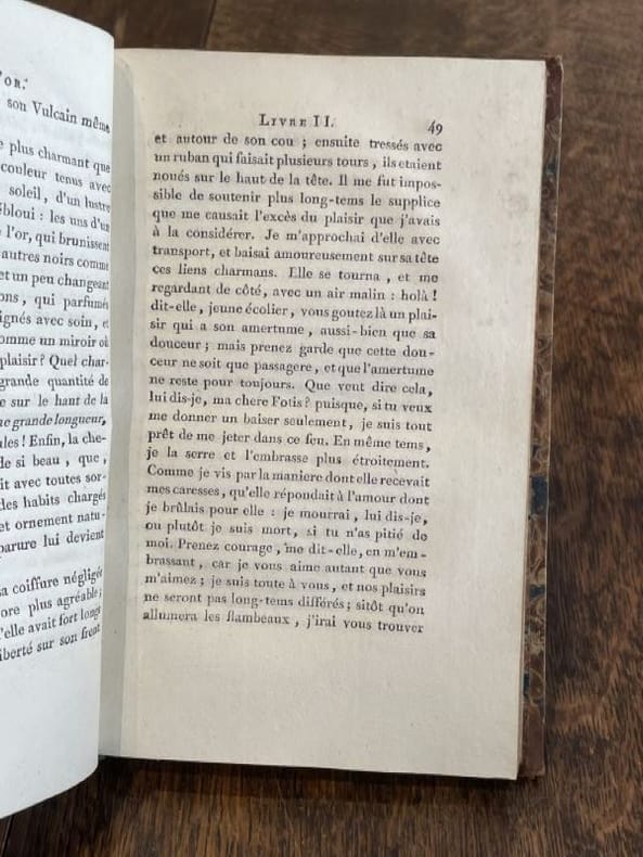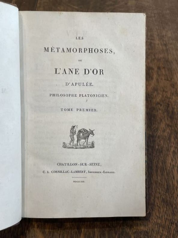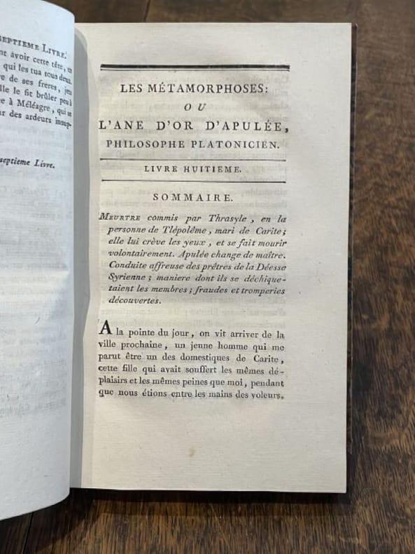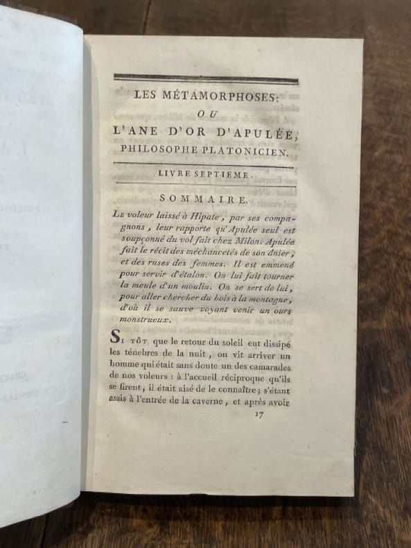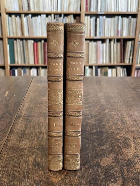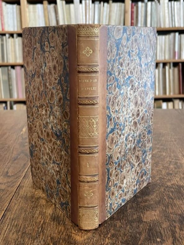 Edition bilingue avec le texte latin et la traduction française de Compain de Saint-Martin en regard. Cette traduction antérieurement publiée (1707-1736) est ici dans une version retouchée et corrigée par J. Fr. Bastien. Elle est accompagnée de notes et de remarques imprimées à la suite de chaque livre. A la fin du tome II, se trouve la traduction française (seule) du Démon, ou esprit familier de Socrate (également d'Apulée). Agréable édition ornée de gravures copiées sur les illustrations composées par Crispin de Passe pour l'édition du même livre en 1623. Quérard I, 78; Cohen, 85.
