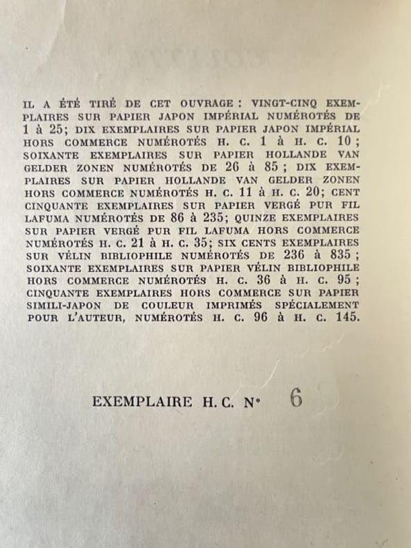 Paris Ferenczi 1934 1 vol. broché in-12, broché, non rogné, 227 pp. Edition originale. Un des 35 exemplaires numérotés sur Japon impérial, tirage de tête, en belle condition.Rédigé en grande partie à La Treille muscate, à Saint-Tropez, pendant l’été 1934, le roman paraît en feuilleton dans Marianne du 12 septembre au 31 octobre, puis en volume chez Ferenczi au mois de novembre.Chez Colette, les histoires d’amour finissent souvent mal. C’est encore le cas dans Duo. Alice et Michel forment un couple uni par la passion du théâtre. Un amour complice, sans ombre, jusqu’au jour où Michel découvre une lettre remplie de mots d’amour. Ceux d’un autre… Cette lettre suffit à tout remettre en cause. Pendant un peu plus de deux jours, enfermés dans leur propriété de Cranssac, qui rappelle par certains aspects Castel Novel, en Corrèze, Alice et Michel s’affronteront jusqu’à l’issue finale du récit…Dans ce roman injustement méconnu et qui est le pendant tragique de La Seconde, paru six ans plus tôt, Colette offre à ses lecteurs un huis clos subtil et poignant sur le thème de la jalousie et de l’amour. Pas d’explications à proprement parler, mais une succession de scènes et de monologues intérieurs qui alternent avec des descriptions où abondent les notations sensorielles – la couleur du buvard, la pluie, la lumière, le chant des oiseaux, le bruit de l’eau - donnant au style un caractère chatoyant, presque impressionniste, que certains critiques reprochèrent à l’auteur, mais qui pour le lecteur contemporain font tout le prix de l’ouvrage.Du roman Paul Géraldy tirera une pièce créée au théâtre Saint-Georges le 10 octobre 1938. La même année Ferenczi rééditera le texte dans sa collection «Le livre moderne illustré», avec des bois gravés de Colette Pettier, suivi par Flammarion qui le reprendra dans sa collection de romans populaires «Select-Collection». En 1939 Colette donnera une suite au roman avec Le Toutounier.Rare en tirage de tête. (Notice de Frédéric Maget pour le catalogue de la collection Colette des Clarac)