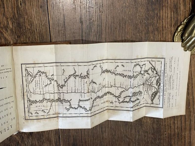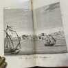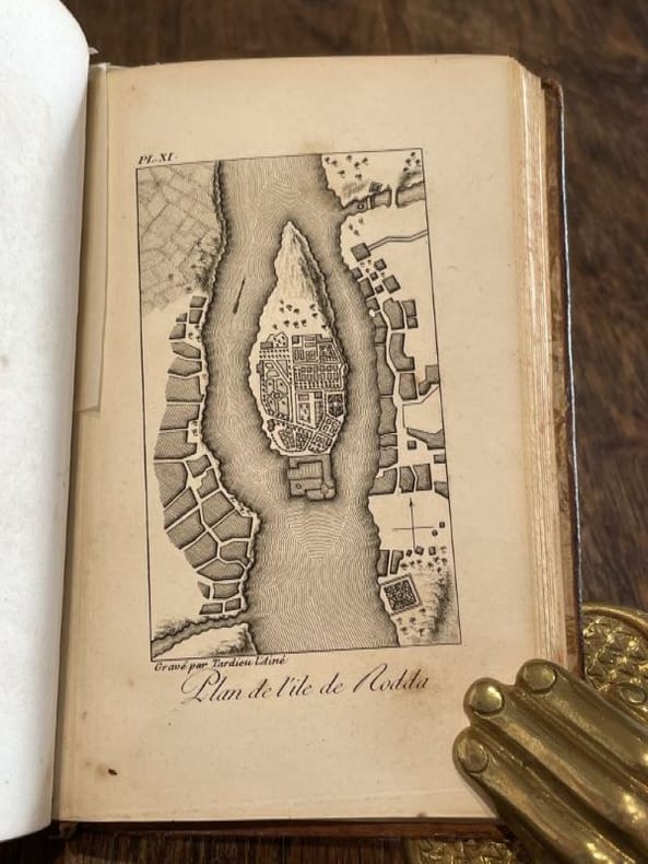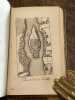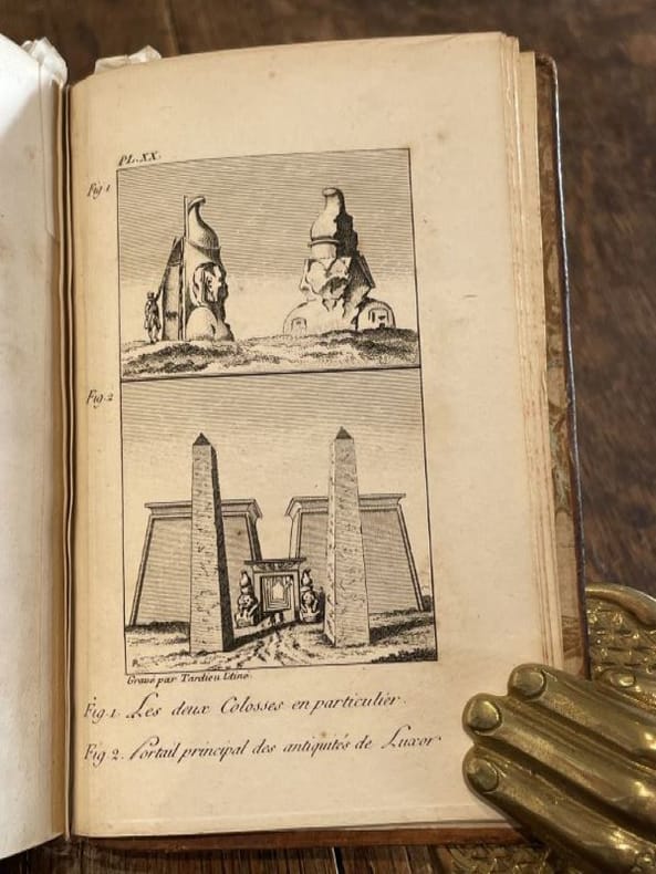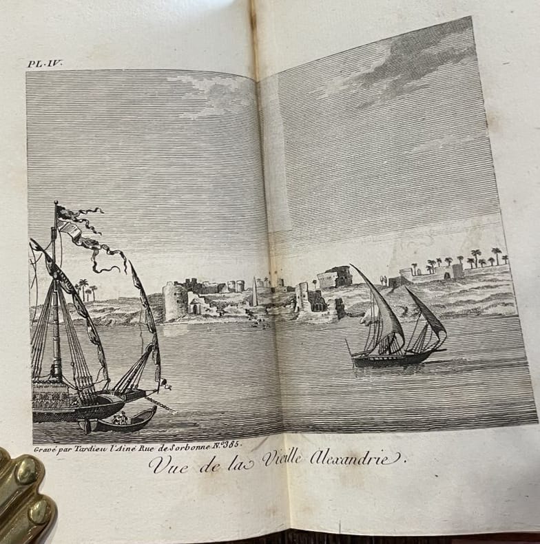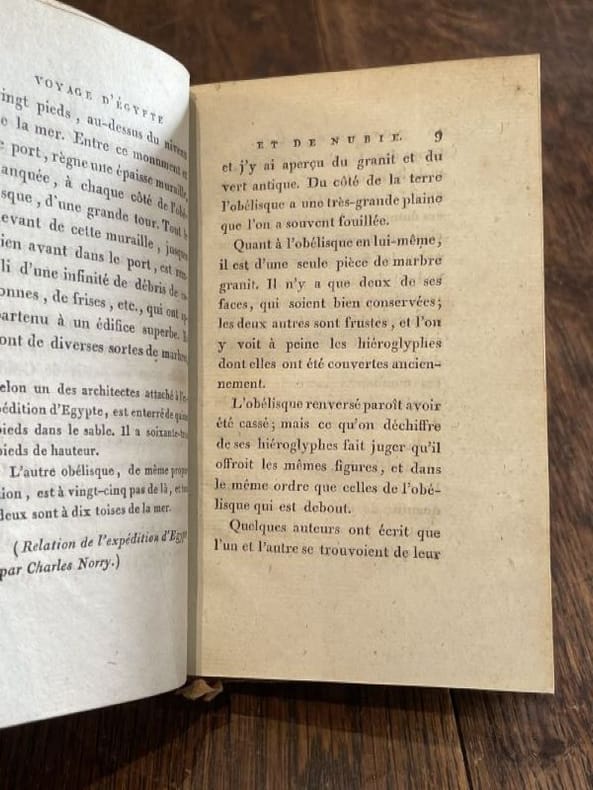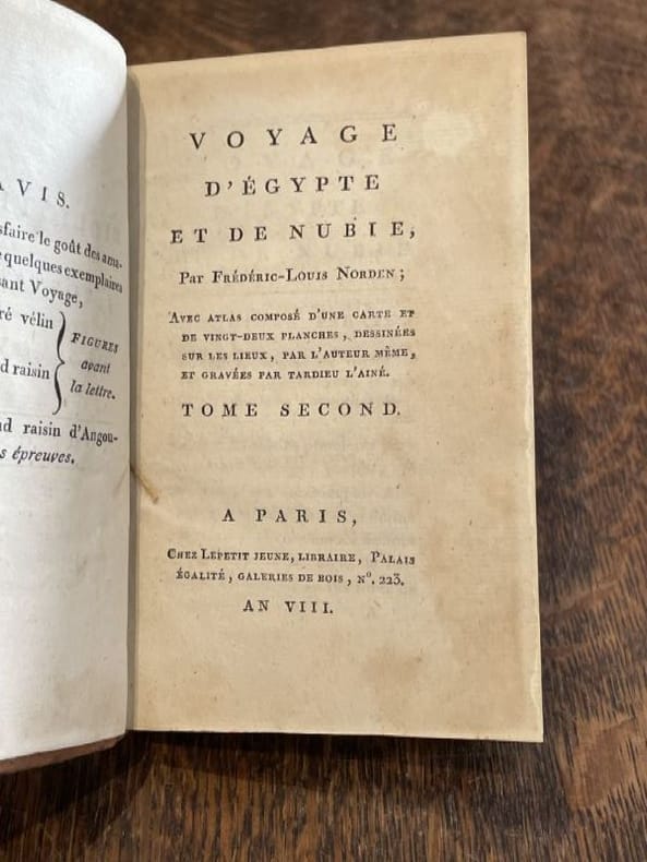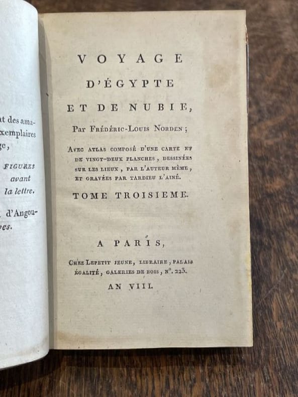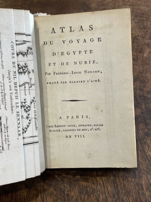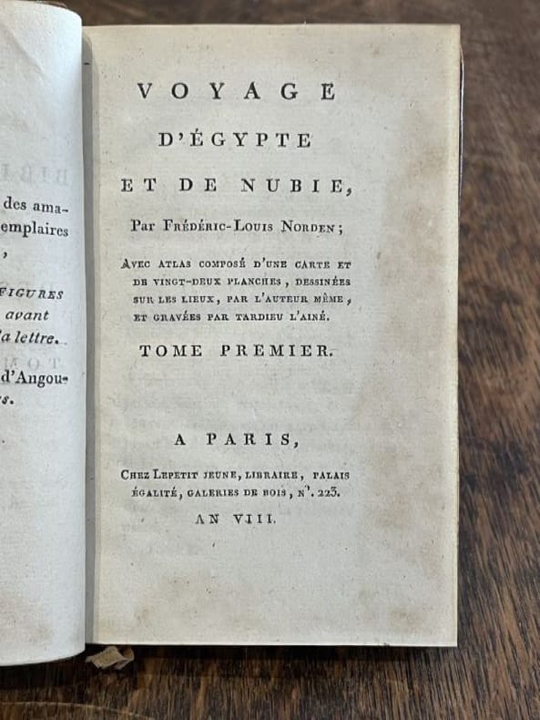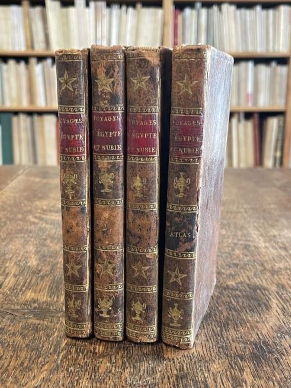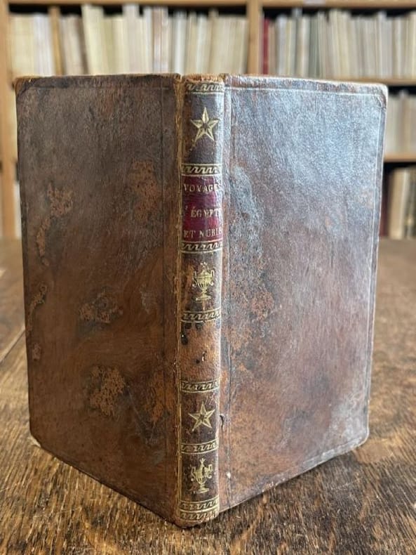 Paris Chez Lepetit Jeune, coll. "Bibliothèque portative des voyages", an VIII [1799] 4 vol. relié 4 vol. in-16, plein veau brun marbré, dos lisses ornés de pièces de titre en maroquin grenat et de filets et petits fers dorés, tranches mouchetées, 159, 192, 205 pp. et 23 planches gravées. Cette première description de l'Egypte, missionnée en 1737 par le roi du Danemark Christian VI, paraît ici en édition portative, de manière très opportune au moment de l'expédition de Bonaparte. Reliure de l'époque un peu usée aux dos et aux angles (avec petit manque à une coiffe), sinon charmant exemplaire complet de l'atlas qui manque souvent.