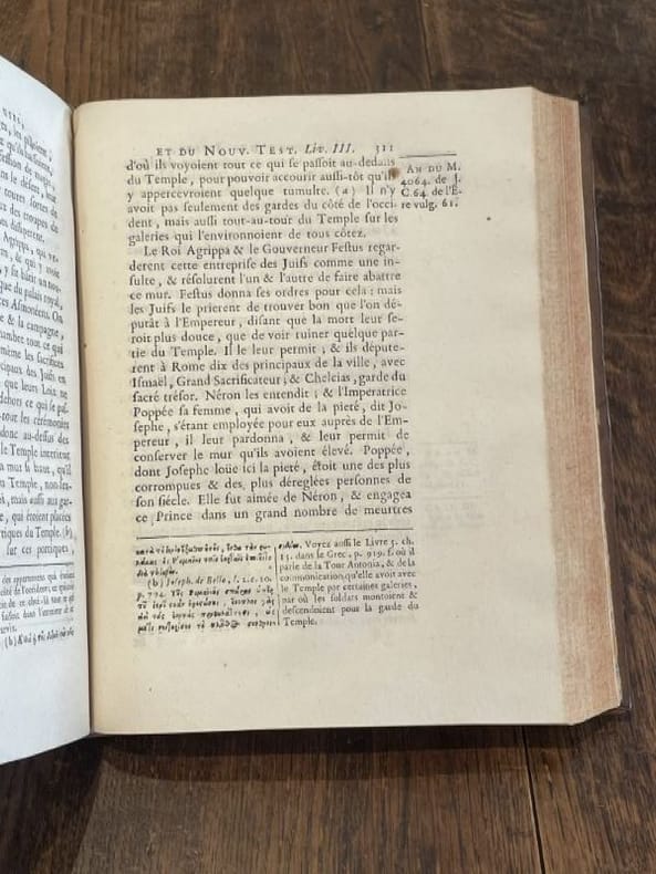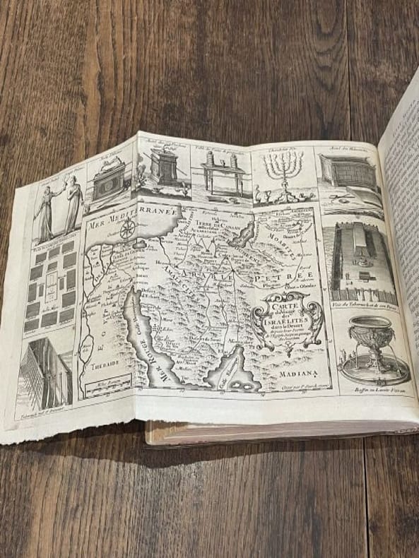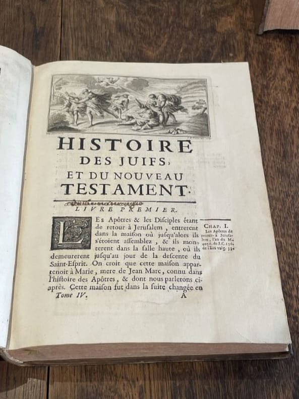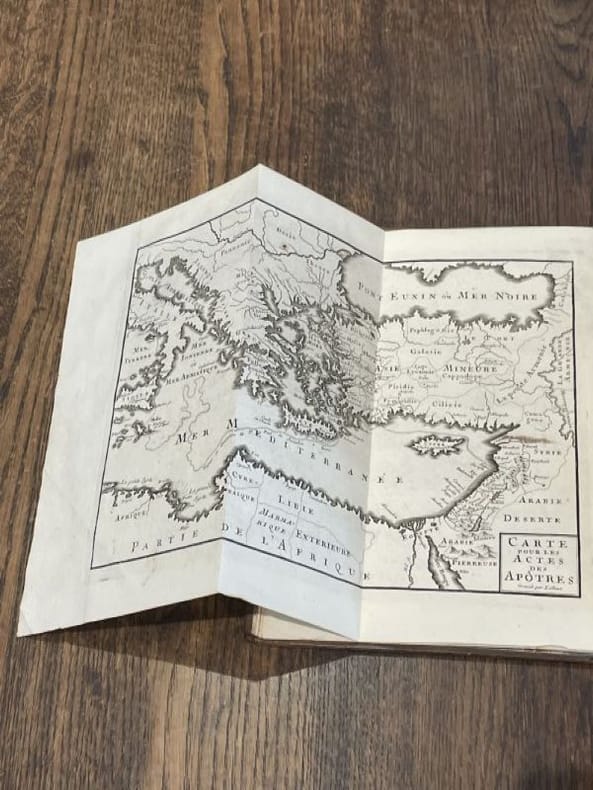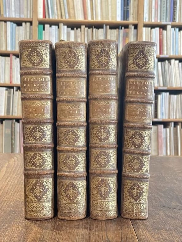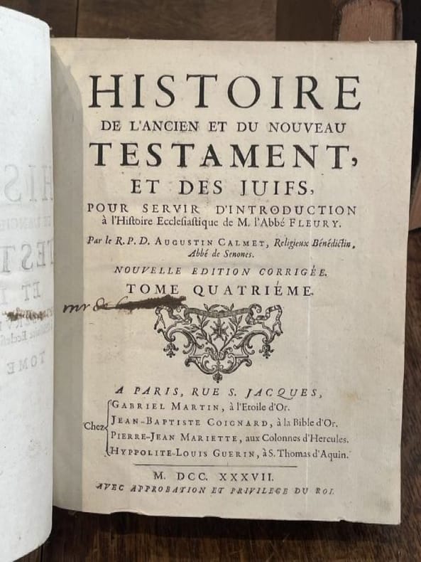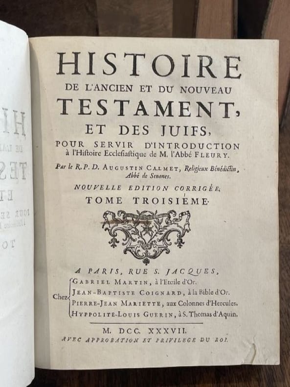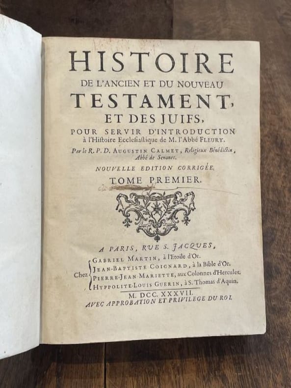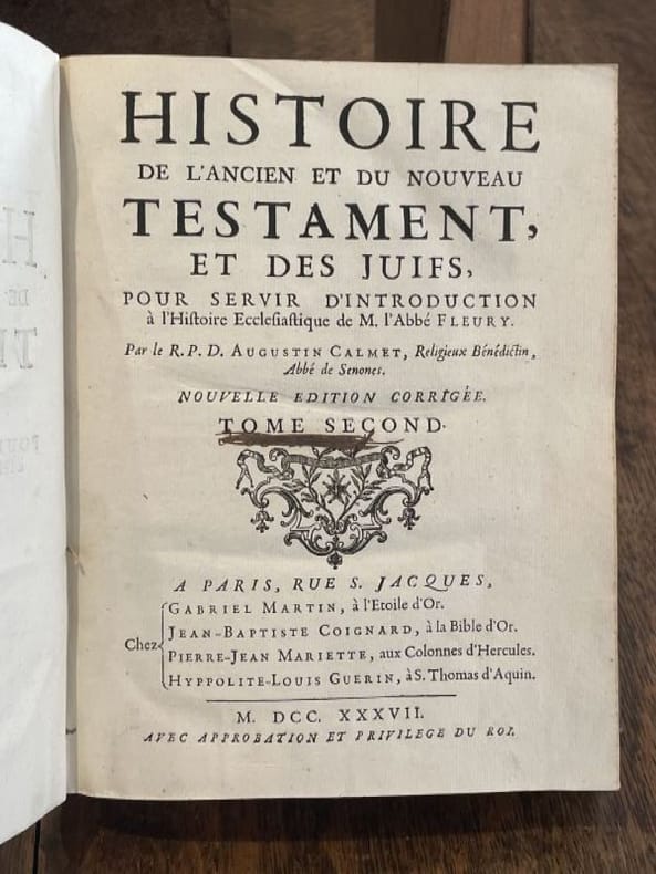 Paris Gabriel Martin, Jean-Baptiste Coignard, Pierre-Jean Mariette, Hyppolite-Louis Guérin 1737 4 vol. relié 4 vol. in-4, pleine basane fauve, dos à nerfs ornés de caissons et fleurons dorés, filets d'encadrement à froid sur les plats, tranches rouges mouchetées, XVI + 140 + 516, 676, 676 et 665 pp., table générale des matières, table des gravures. Nouvelle édition, revue et corrigée, de cette somme de l'historien et exégète lorrain, Augustin Calmet ou Dom Calmet (1672-1757). Exemplaire bien complet des différentes planches gravées : au tome 1, "Carte géographique du monde ancien suivant le partage des enfants de Noël après leur dispersion arrivée à Babel" (dépliante), "Carte du Paradis terrestre", "Carte du Voyage des Israélites dans le désert depuis leur sortie de l'Egypte jusqu'au passage du Jourdain" (dépliante avec ses différentes figures illustratives), "Carte de la Terre Promise". Tome 2, "Plan nouveau de l'ancienne Jérusalem" (dépliante), "Plan et élévation du temple de Salomon" (dépliante avec ses différentes figures illustratives). Tome 3, "Plan du temple rebaty par Hérode le Grand" (dépliante). Tome 4, "Carte pour les Actes des Apôtres" (dépliante et gravée par Liébaux). Ex libris manuscrits rayés (tome 2 et 3), quelques épidermures sur les plats (plat inférieur du tome 2), défaut papier ( tome 3, p. 557), sinon bon exemplaire convenablement conservé.