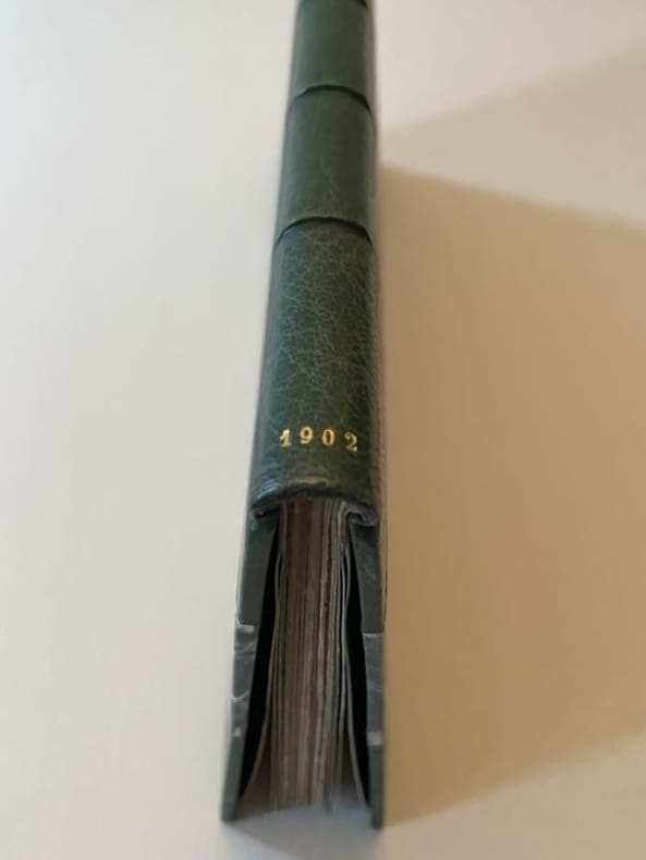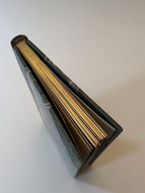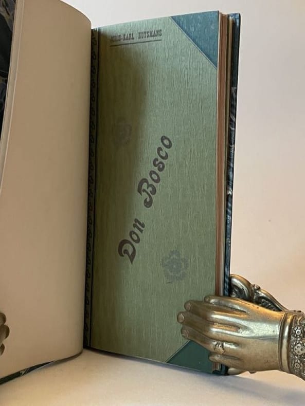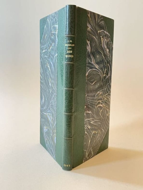 S.l.n.d. [Paris, Imprimerie J. Bologne 1902] 1 vol. broché in-8 étroit, demi-maroquin vert à coins, dos à nerfs, tête dorée, couvertures et dos conservés, non rogné (E. Magnac), 80 pp. Édition originale rare illustrée de 6 vignettes in texte en noir et 12 planches hors-texte, dont un portrait-frontispice, tirées en vert sur papier glacé. Le texte est encadré d'un filet décoratif Art Nouveau et le premier plat de couverture est agrémenté d'une frise avec une police de titre dans le même esprit et en préface un sonnet de François Coppée dédié à Huysmans. Les deux écrivains s'étaient rendus "dans une maison de Ménilmontant où les pères salésiens recueillaient les jeunes enfants du peuple pour les éduquer et leur donner un métier" (G. Chastel, J.-K. Huysmans et ses amis). Fondateur de l'ordre des Salésiens, Saint Jean Bosco, canonisé en 1934, fut un des grands éducateurs du XIXe siècle. C'est à la demande des pères salésiens de Paris que Huysmans rédigea cette courte biographie imprimée à petit nombre dans leur école typographique. Bel exemplaire, très bien relié.