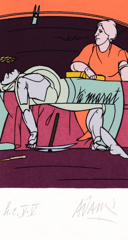 Paris Galilée, coll. "Débats" 2009 1 vol. broché in-8 étroit, broché, couverture à rabats, non coupé, 80 pp. Édition originale de ce texte sur Charlotte Conday, figure incarnant "la morale et la vertu, la pureté et l'idéal dans un monde où triomphent le vice, l'immoralité, l'impureté, la haine". Un des 60 exemplaires de luxe numérotés, les seuls comportant une sérigraphie en couleurs signée et numérotée par Valerio Adami, celui-ci étant l'un des 5 exemplaires hors commerce justifié "H.C. V/V". Bandeau éditeur conservé. En excellente condition.