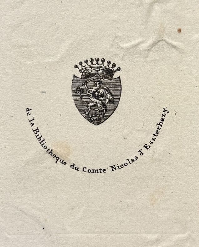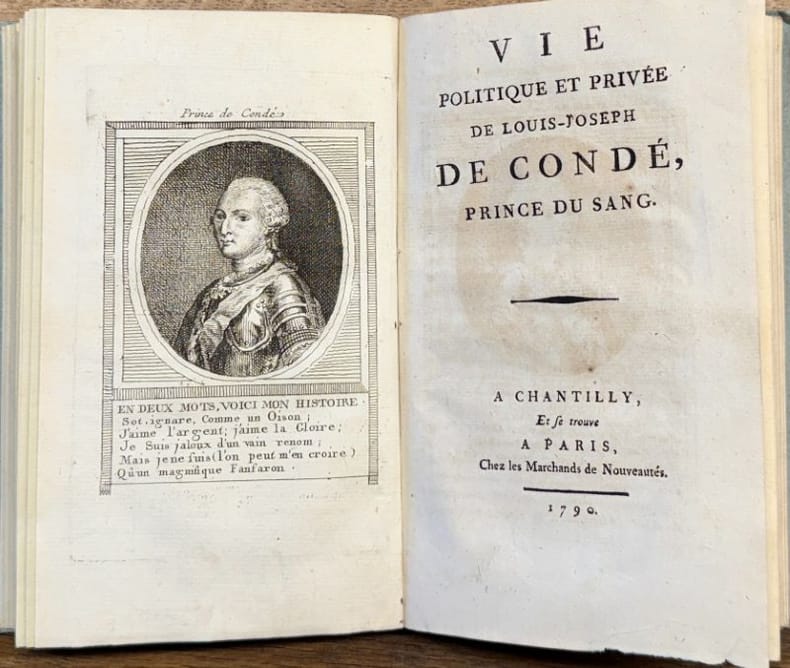 Paris chez les Libraires du Palais Royal 1790 1 vol. relié in-8, bradel cartonnage papier gris, (2) + 78 pp., portrait-frontispice. Edition originale. [Reliée à la suite :] Vie politique et privée de Louis-Joseph de Condé, prince du sang. Chantilly et Paris, chez les Marchands de Nouveautés, 1790, 80 pp., portrait-frontispice. Edition originale. Réunion de ces deux pamphlets révolutionnaires demeurés anonymes, l'un présentant Louis XVI comme un monarque légitime mais faible et manipulé par son entourage, l'autre brossant un portrait à charge du prince de Condé "...un sot, un ignare, un glorieux, un fanfaron" qui "dans le cours de sa vie, n'a commis que des sottises". Ex-libris gravé : "de la bibliothèque du comte Nicolas d'Eszterhazy". Bon exemplaire, dans un cartonnage du début du XIXe siècle.