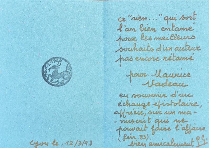 St Didier au Mont d'Or VR / SO 1993 1 vol. broché plaquette in-16, brochée, 29 pp. Edition originale. On joint une lettre manuscrite de l'auteur adressée à Maurice Nadeau, agrémentée d'un petit portrait dessiné à l'encre. Très bon état.