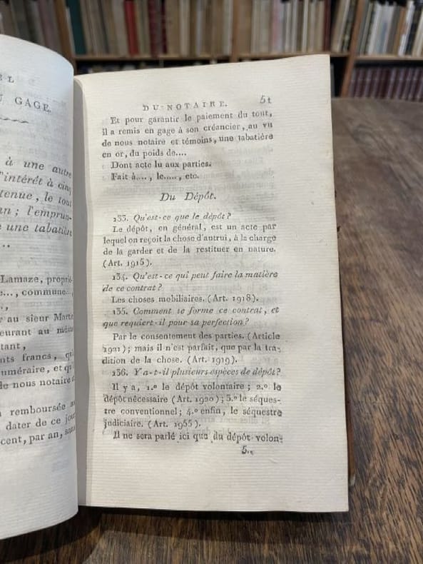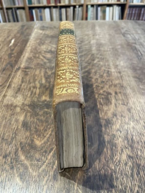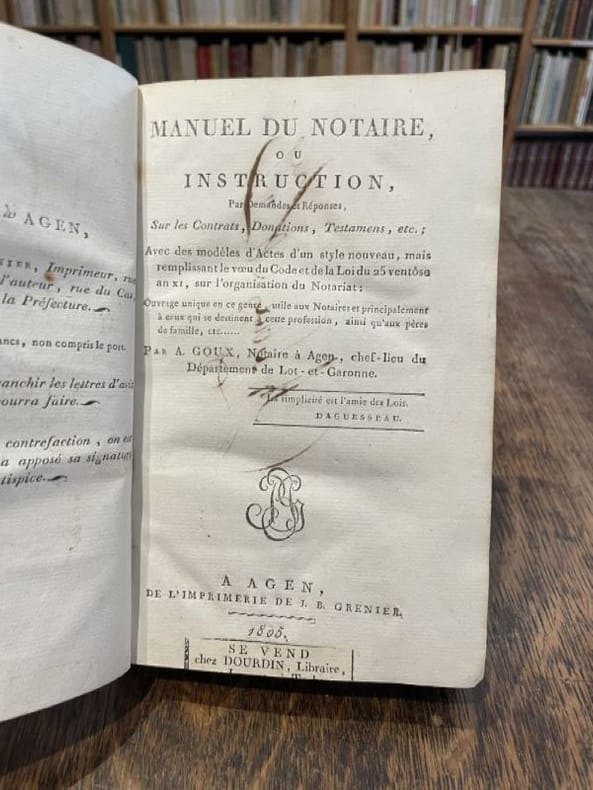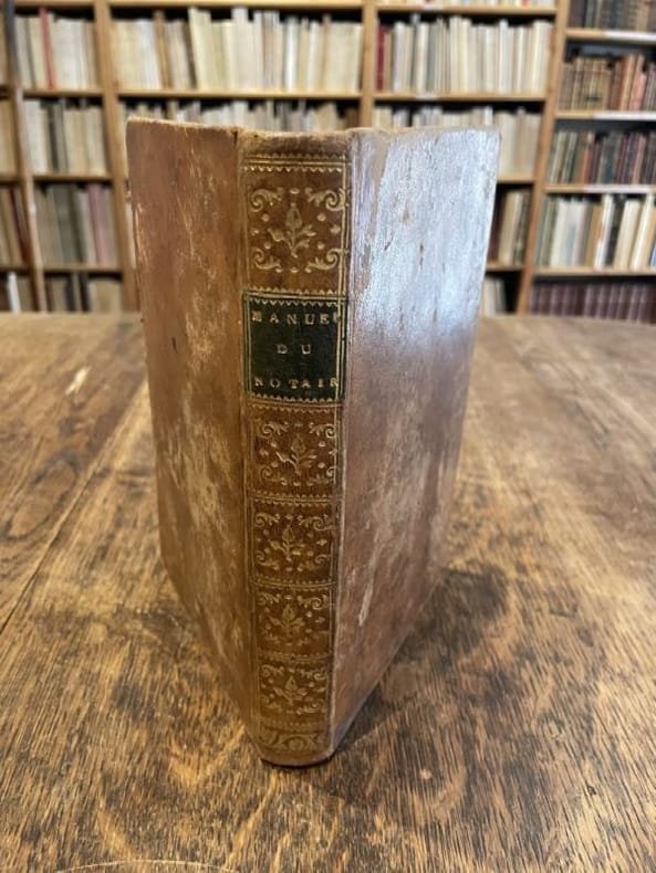 Agen J.-B. Grenier 1805 1 vol. Relié in-8, plein veau blond, dos lisse orné de filets, fleurons et guirlandes dorés, pièce de titre de maroquin vert, tranches jaunes, XVI + 354 + 20 + 9 pp. Edition originale de ce manuel qui sera plusieurs fois réédité jusqu'en 1818, par un notaire d'Agen avec sa signature autographe au verso de la page de titre. Agréable reliure de l'époque, malgré de minimes traces d'usure sur les plats.