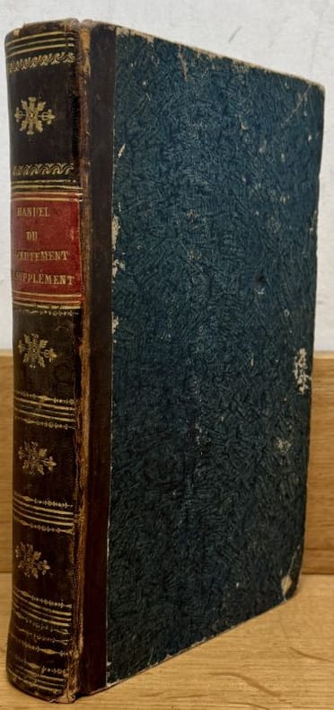 Paris De l'Imprimerie Royale 1820 1 vol. relié in-8, demi-basane tabac, dos lisse orné de fleurons et filets dorés, pièce de titre, XVI + 492 + VI + 168 pp. [Relié à la suite : ] Supplément au Manuel de recrutement... Décembre 1822. Reliure un peu frottée, sinon exemplaire en bonne condition, complet du supplément de 1822.