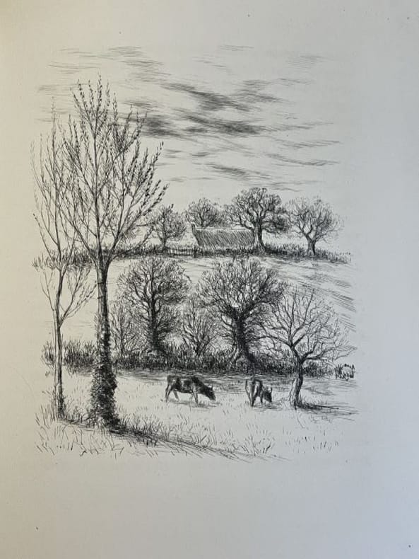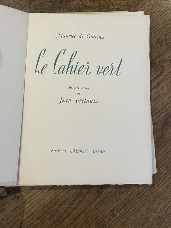 Paris, Manuel Bruker, 1955. In-4, en feuilles sous étui et chemise, couverture, 169 pp. Tirage limité numéroté à 215 exemplaires sur vélin blanc d'Arches, celui-ci étant un des 125 premiers réservés aux Membres de la Société "Beaux Livres Grands Amis", portant le n°28 et imprimé pour le Docteur Pingat. Ouvrage illustré de 38 pointes sèches in et hors texte en noir par Jean Frélaut. On trouve en début d'ouvrage des "Allocutions prononcées à l'Assemblée Générale de "Beaux Livres-Grands Amis" à l'occasion de la remise du "Cahier Vert" de Maurice de Guérin illustré de 38 pointe sèches de Jean Frélaut" en 12 ff sous couverture. Intérieur frais. Légères traces d'usures sur l'étui, brunissures sur la couverture.