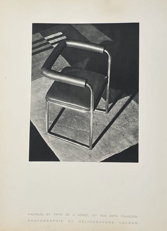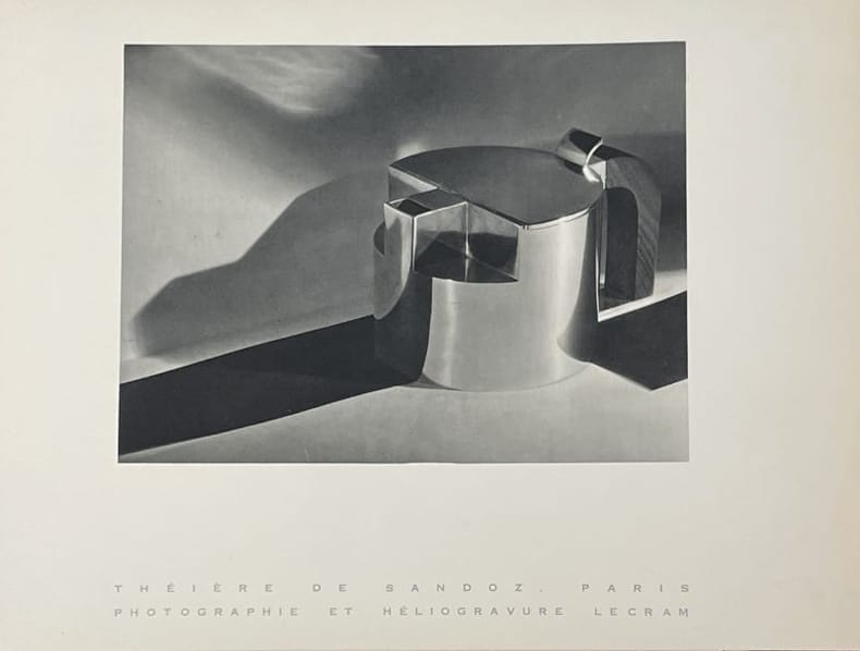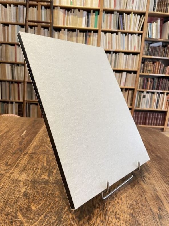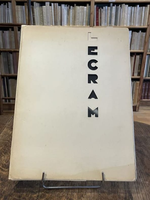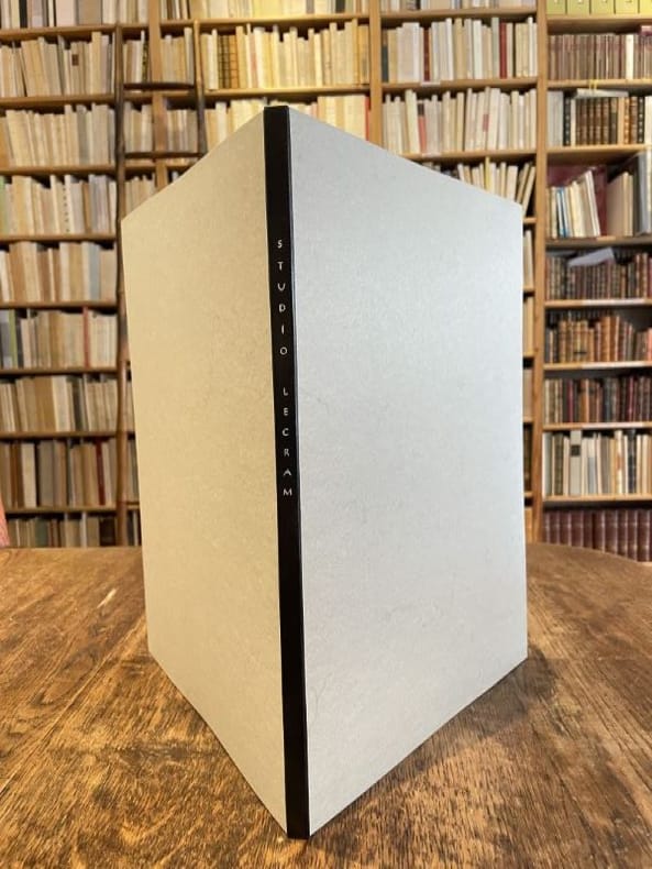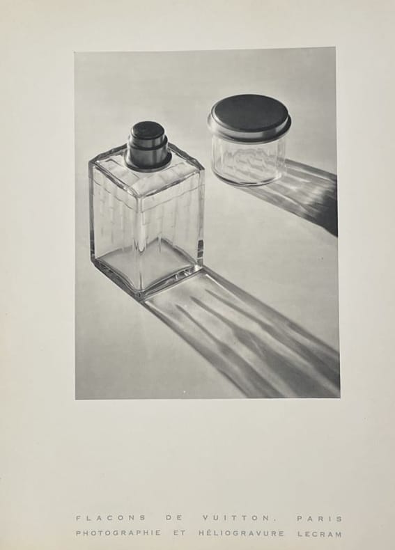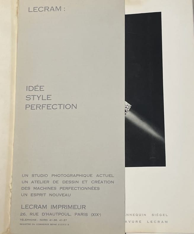 Paris Lecram Imprimeur, s.d. [1930] plaquette gr. in-4 (36,7 x 26,7 cm), en feuilles, portefeuille de carton ivoire avec le nom Lecram découpé sur le premier plat, chemise imprimée de papier gris couverture, le tout placé sous chemise cartonnée avec dos de box noir titré à l’oeser argent et doublure de feutrine grise et étui (Alain Devauchelle). Bel album Art Déco illustré de photos attribuables à André Vigneau, directeur artistique de l'imprimerie Lecram-Presse qui se lançait alors dans le créneau de la photographie publicitaire. On compte 14 planches (8 en héliogravure et 6 en photogravure) présentant chacune une publicité conçue pour une grande maison : Bugatti, Dunhill, Dunlop, Grande Maison de blanc, Mauboussin, Perugia, Vuitton, etc. La dernière planche ("Couverture de programme") est reproduite dans Photographies 1930 d'Arts et Métiers graphiques, p. 126. Portefeuille très légèrement sali, mais ensemble en belle condition et très rare.