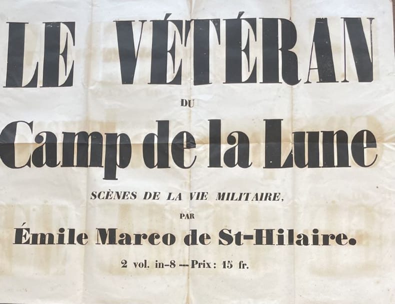 Paris Pétion 1844 2 vol. broché 2 vol. in-8, brochés, sous couvertures jaunes imprimées, non coupés, VII + 340 et 379 pp. Edition originale de ce récit napoléonien, genre dont Émile Marco de Saint-Hilaire s’était fait une spécialité. Quelques petites rousseurs, mais bon exemplaire en brochures d'origine auquel on joint la très rare affichette imprimée pour promouvoir le livre dans les librairies (43 x 53 cm, pliée en quatre).