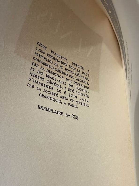 Plaquette tirée à 1000 exemplaires numérotés sur velin d 'Arches, celui-ci N° 64.On a joint 2 cartes de visite du Gouverneur général de l' Algérie.8 Photographies de Marcel BOVIS. (CO2B)