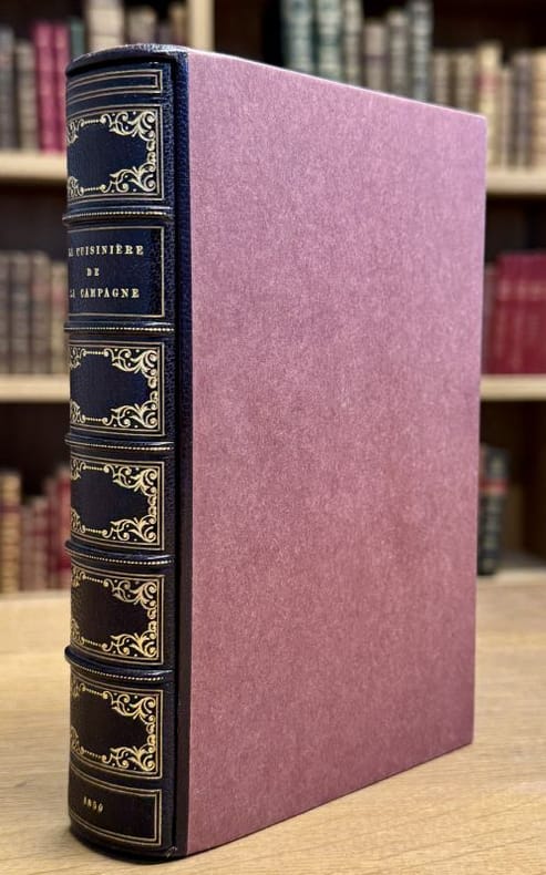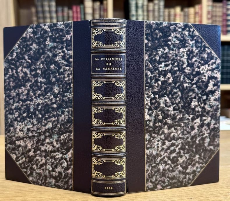 Paris Audot 1850 1 vol. relié in-12, demi-maroquin brun à coins, dos à nerfs, caissons encadrés de filets et arabesques dorés, tête dorée, étui bordé (A. Devauchelle), 647 + (1) pp., 240 figures dans le texte, index. Bel exemplaire dans une fine reliure signée de ce classique de la gastronomie.