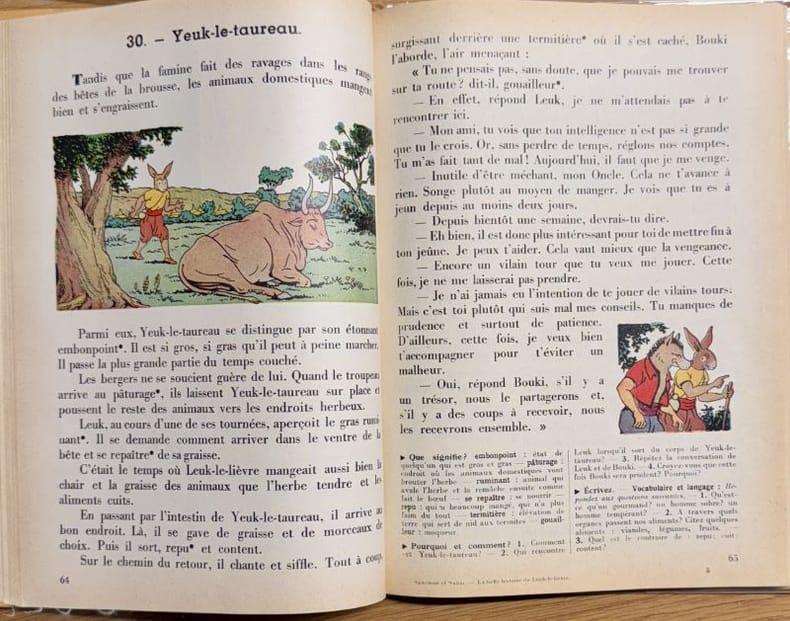 Paris Hachette 1959 1 vol. relié in-8, percaline éditeur orange avec le plat supérieur illustré, 173 pp. Méthode d'apprentissage et de lecture du français spécialement "adaptée au milieu africain et à la psychologie profonde de l'enfant noir" dont les auteurs assurent en préface qu'elle "est animée par l'intuition surréaliste des forces invisibles et surhumaines, des forces cosmiques". Exemplaire en belle condition portant sur le premier contreplat un cachet d'une école primaire pour filles d'Abidjan.