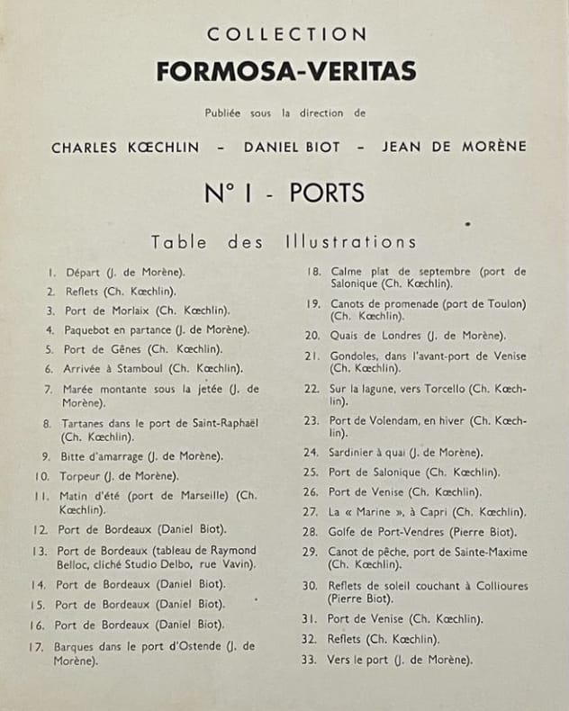 Paris Imp. de Vaugirard, coll. "Formosa-Veritas" 1933 1 vol. broché in-8, broché, couverture illustrée, non paginé. Bel album de 33 photographies à pleine page des ports de Morlaix, Bordeaux, Salonique, Venise ou Londres prises par Charles Koechlin, Jean de Morène, Daniel et Pierre Biot. En bonne condition.
