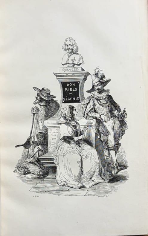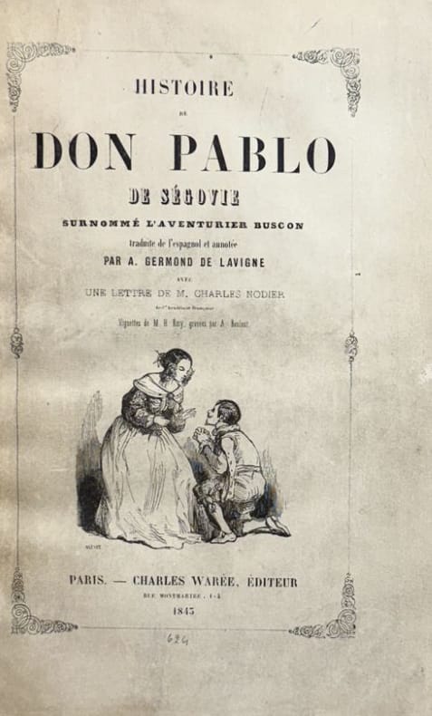 Première édition de cette traduction illustrée de nombreuses vignettes in-texte, gravées sur bois (enrichie de culs de lamps et de bandeaux ornementaux). Vicaire (V-899) signale 50 exemplaires de tête sur papier de couleur. Il s'agit ici de la 4ème traduction française de ce texte célèbre (publié pour la première fois en 1626) dont le titre varie selon les traducteurs (L'aventurier Buscon, Le grand Taquin, Le grand Vaurien, Le fin Matois). Germond de Lavigne donne dans sa lettre préface de précieuses informations sur l'histoire de cet ouvrage et de ses différentes adaptations. La lettre de Charles Nodier n'est, quant à elle, qu'une caution littéraire apportée au travail du traducteur. "Pablo de Ségovie, est, après Lazarille de Tormes, l'aîné de tous ces joyeux garçons, coureurs d'aventures, frippons, gourments, insolents et poltrons dont fourmilles l'Espagne au XVIIème s. "(extrait de la préface).