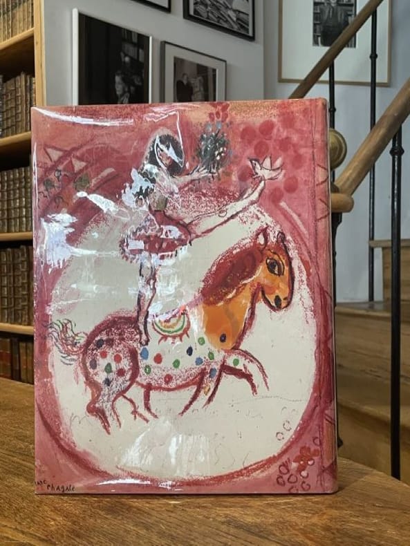 Monte-CArlo André Sauret 1965 1 vol. relié in-4, toile éditeur rouge, jaquette illustrée et rhodoïd imprimé, 171 pp. Superbe recueil consacré au cirque. Édition originale du texte de Prévert et premier tirage des 76 photographies en noir et blanc d'Izis imprimées en héliogravure. L'ouvrage comprend également 4 compositions originales de Marc Chagall reproduites en couleurs (un frontispice, une sur double page et 2 à pleine page répétées sur la jaquette). Très bel exemplaire, sauf un manque d'un centimètre sur le second plat du rhodoïd.