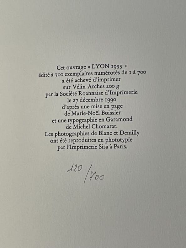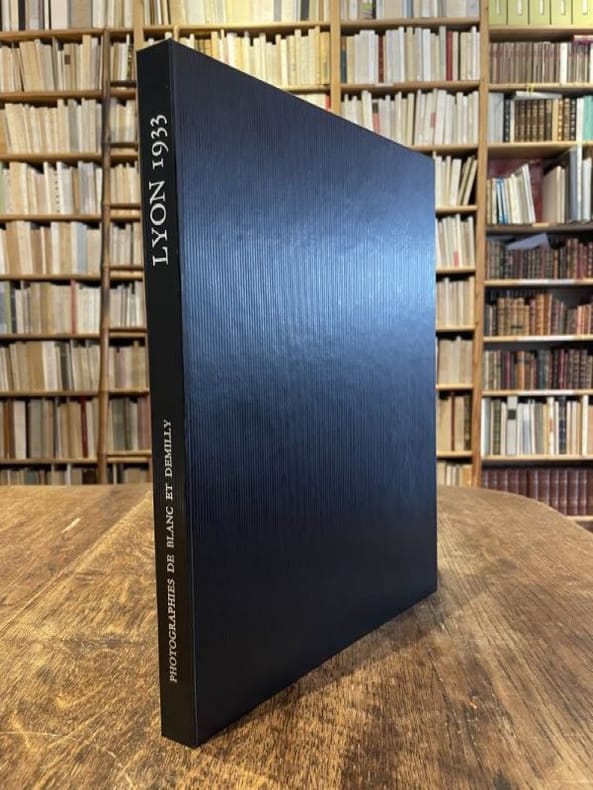 Lyon Fondation nationale de la Photographie 1990 1 vol. broché in-folio, en feuilles, chemise cartonnée noire, étui, non paginé. Luxueux album de 32 planches en phototypie contrecollées d'après l'album de 1933 "Aspects de Lyon" par Blanc et Demill, accompagnées d'un texte de Jean Reverzy "Lyon et le brouillard" en version bilingue (français / anglais). Tirage unique à 700 exemplaires numérotés sur vélin d'Arches. En excellente condition.