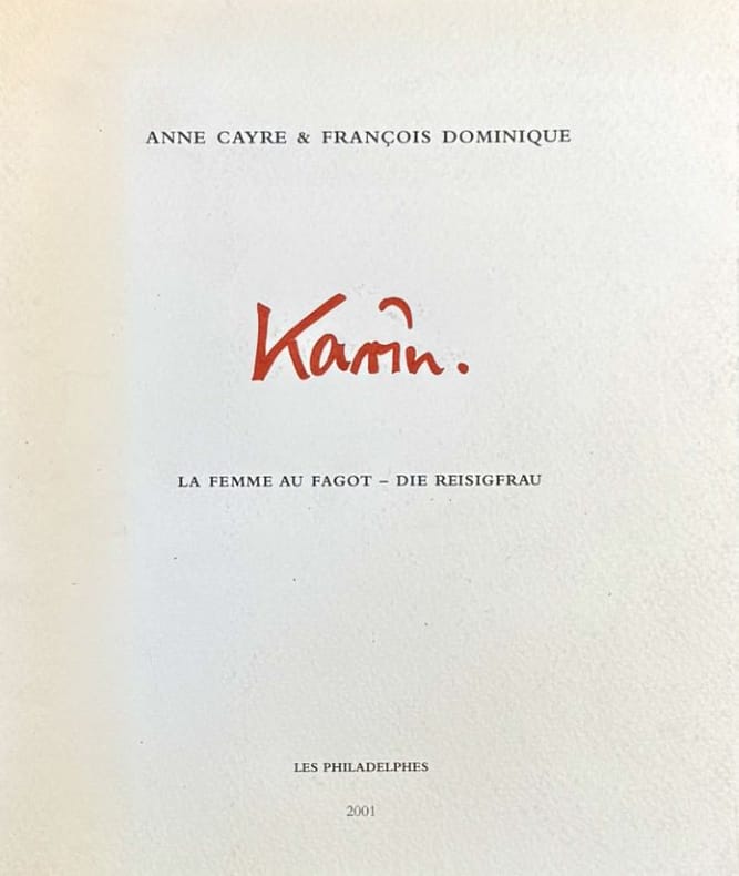 Les Philadelphes 2001 1 vol. broché in-8 carré, broché, couverture à rabats, non paginé, reproductions en couleurs d'après les peintures de Karin. Edition originale. Un des 300 Tintoretto ivoire, celui-ci justifié HC et signé par l'artiste et les auteurs. Envoi autographe signé de François Dominique à un poète et critique. Bon état.
