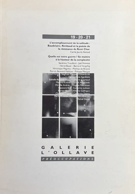 Rustrel Galerie L'Ollave 2002 1 vol. broché in-4, broché, 82 pp., reproductions en noir. Textes bilingues français anglais de Hervé Bauer, Mathias de Breyne, Fred Forest, Mireille Andrès Bernard Noël, Michel Deguy, etc. Précédé de : L'accomplissement de la solitude : Baudelaire, Rimbaud et la poésie de la résistance de René Char, par Carrie Jaurès Noland. Bon état.