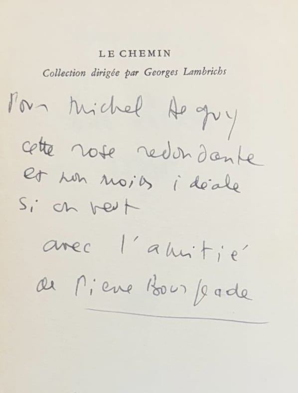 Paris Gallimard, coll. "Le Chemin" 1968 1 vol. broché in-12, broché, couverture à rabats, 178 pp. Edition originale en service de presse avec un envoi autographe signé de l'auteur à un poète et critique. Couverture passée, sinon en bon état.