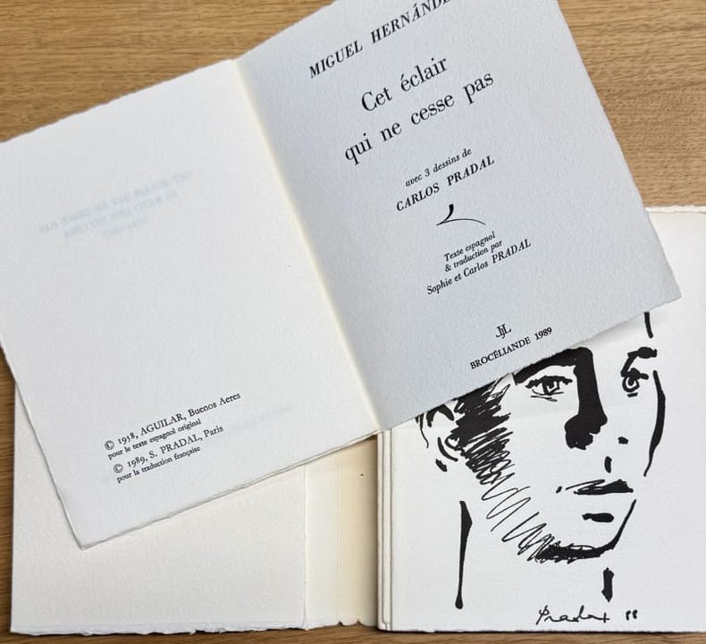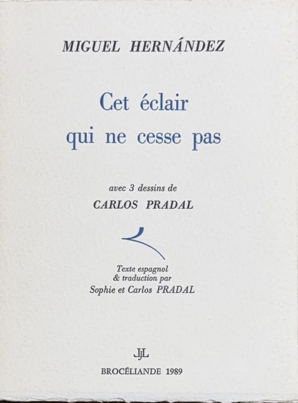 Paris Brocéliande, coll. "Altazor" 1989 1 vol. en feuilles in-12, en feuilles sous couverture imprimée à rabats, 87 pp. Edition bilingue de ce poème d'un héros de la guerre civile avec le texte espagnol et la traduction française originale de Sophie et Carlos Pradal, illustrée de 3 dessins à l'encre par ce dernier. Tirage limité à 275 exemplaires sur vélin Johannot, celui-ci l'un des 25 hors commerce numérotés justifié au crayon par l'artiste. Belle condition.
