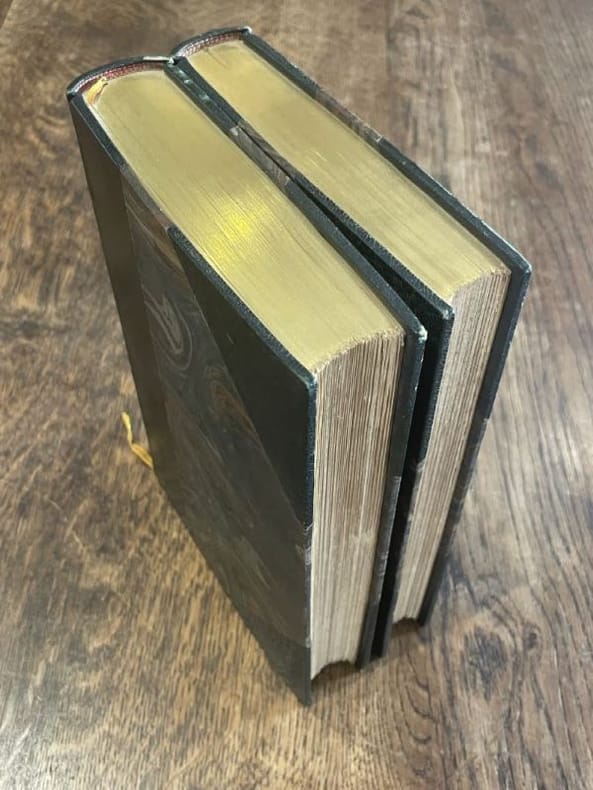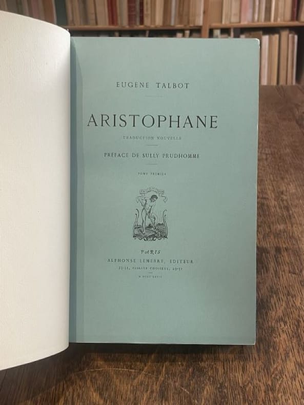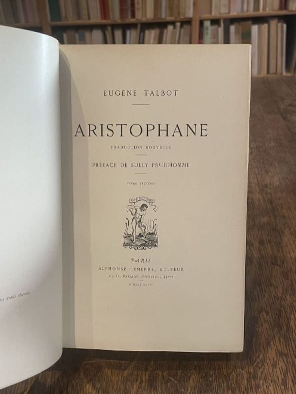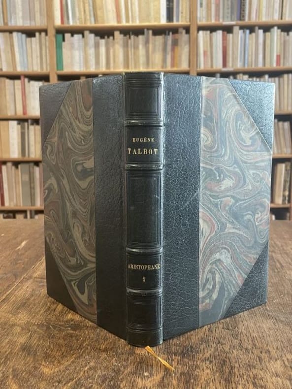 Paris Lemerre 1897 2 vol. reliés 2 vol. gr. in-8, demi-maroquin vert sapin à coins, dos à quatre nerfs, têtes dorées, couvertures conservées, VIII + 403 et 505 pp. Édition originale collective de la traduction française comprenant Les Akharniens, Les Chevaliers, Les Nuées, Les Guêpes, La Paix, Les Oiseaux, Lysistrata, Les Thesmophoriazouses, Les Grenouilles, L'Assemblée des femmes et Ploutos. Avec un avant-propos de Sully Prudhomme. Fine reliure de l'époque exécutée pour la librairie Louis Conard.