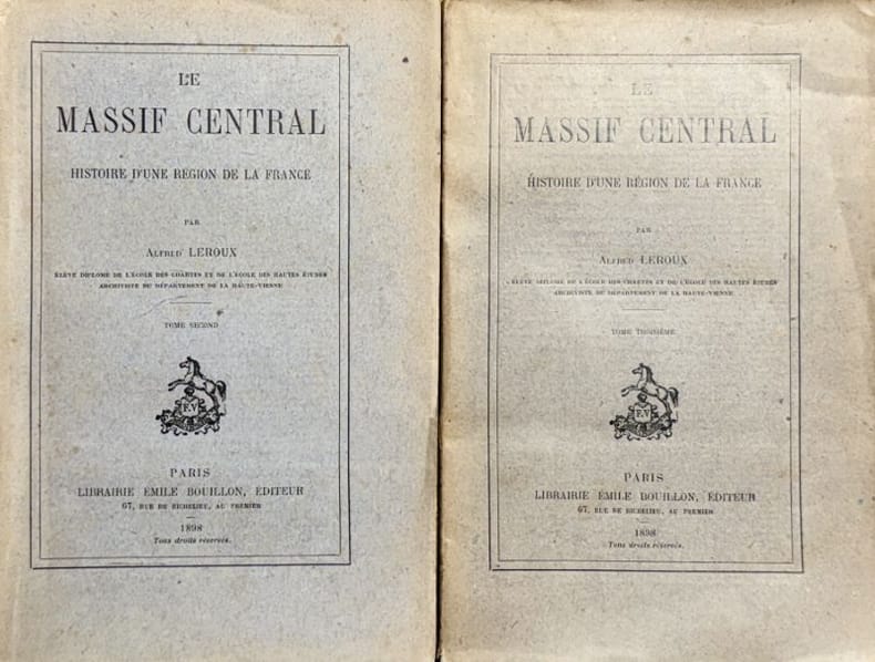 Paris Librairie Emile Bouillon 1898 2 vol. broché 2 vol. in-8, brochés, 385 + 309 pp. Manque le tome 1. Tome 2 : L'exploitation économique du Massif (agriculture, industrie, voies de communication, commerce) ; La civilisation dans le Massif (moeurs et croyances). Tome 3 : Idiomes vulgaires du Massif ; Arts, sciences et lettres ; Etat social de la population ; Les événements et les hommes ; La place du Massif dans l'histoire de France ; table analytique. Couvertures un peu défraîchies, sinon en bon état. Tomes 2 et 3 seuls. Peu courant.