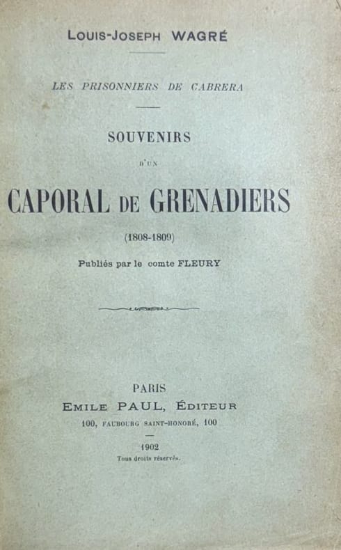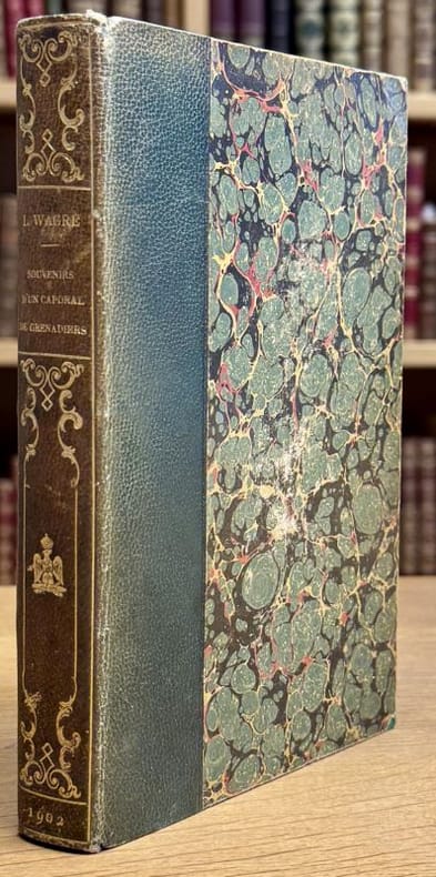 Paris Emile Paul 1902 1 vol. relié in-18, demi-chagrin vert, dos lisse orné en long de motifs doré, aigle impérial en fleuron, tête dorée, couvertures conservées, VII + 295 pp., frontispice en couleurs. "Avec ses camarades, Wagré fut déporté à l'île de Cabrera après la capitulation de Baylen. Il a consigné le récit de ses souffrances" (Tulard, 783). 1 feuillet manuscrit (moderne) relié en tête. Dos légèrement frotté, sinon en très bon état.
