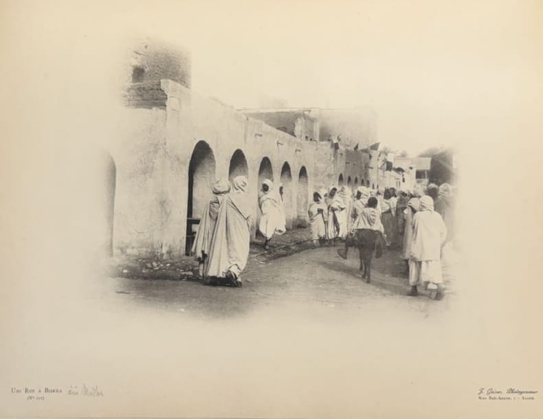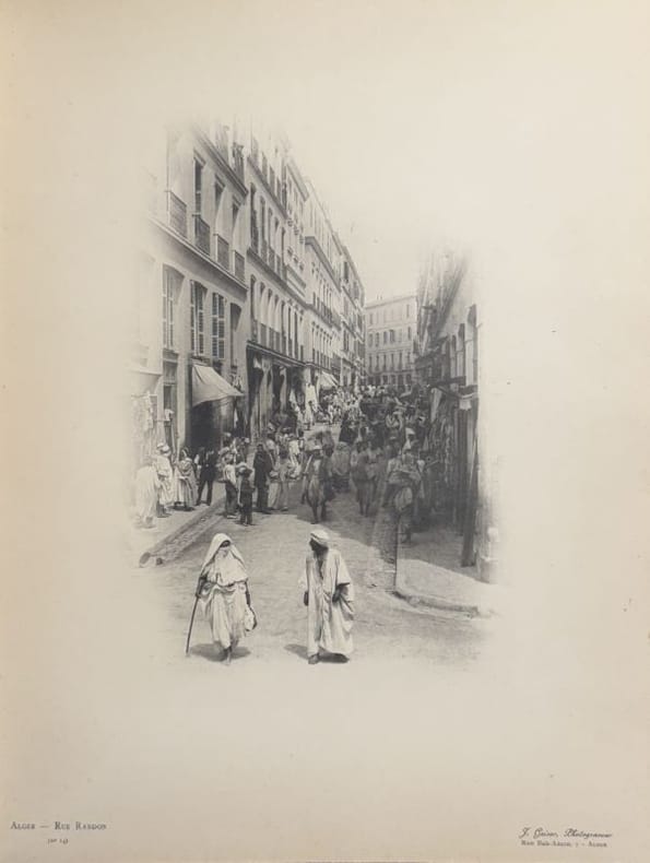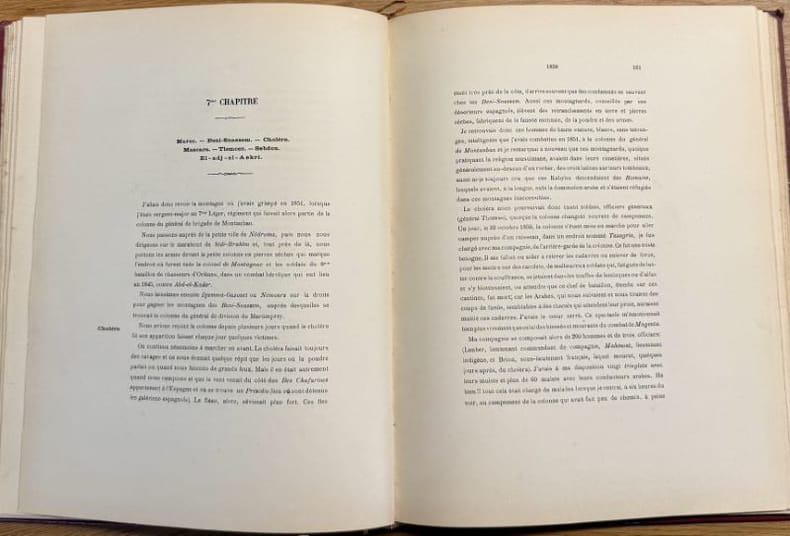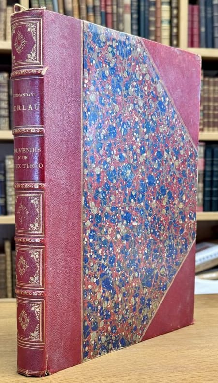 [Buzançais] [Imprimerie Deverdun-&-Jaguin] 1898 1 vol. relié in-4, demi-chagrin cerise à coins bordé d'un triple filet doré, dos à nerfs orné de fleurons et encadrements dorés, tête dorée (reliure de l'époque), 285 + (2) + 22 + (10) pp. Edition originale de ces souvenirs du commandant Berlau. Né en 1824, il s'engage au 7e régiment d'infanterie légère et passe au bataillon des tirailleurs indigènes d'Oran en 1852. Nommé commandant du 1er bataillon des mobiles des Bouches du Rhône en 1870 rassemblé à Marseille, il s'embarque pour l'Algérie afin de relever les troupes régulières envoyées en France pour combattre les Prussiens. Le bataillon participe en 1871 à la répression du mouvement insurrectionnel qui secoue la province et relève notamment la garnison de Bordj Bou Arreridj assiégé par les Arabes.Exemplaire truffé de 4 belles photographies (31,5 x 25 cm) d'Alger par Jean Geiser (atelier J. Geiser, photograveur, au 7 rue Bab-Azoun à Alger). Le photographe suisse (1848-1923) est célèbre pour ses clichés artistiques de l'Algérie durant toute la seconde moitié du XIXe siècle et pour les nombreuses cartes postales qu'il a éditées à partir de 1897.Manque la page de titre. Reliure un peu usée. De toute rareté. Manque à la BnF.