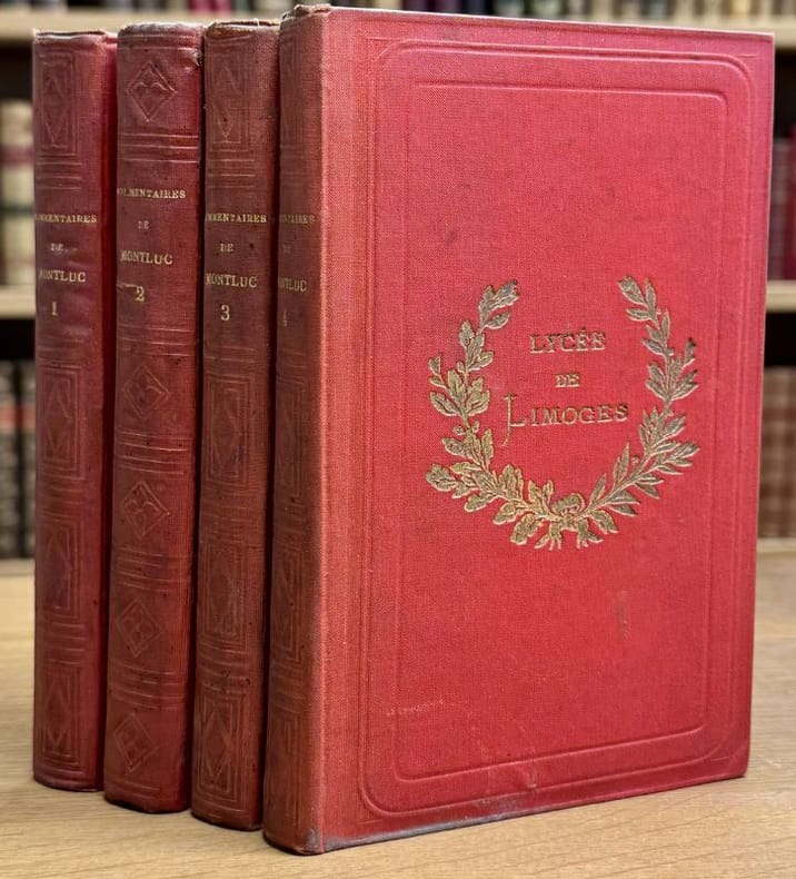 L'exemplaire est bien complet de l'intégralité des "Commentaires de messire Blaise de Montluc, maréchal de France, où sont décrits les combats, rencontres, escarmouches, batailles, sièges, assauts [etc... ]", mais divisé en chapitre pour plus de clarté et en orthographe modernisée. "Voici un livre dont Henri IV, bon juge, a dit qu'il mériterait d'être appelé la Bible des gens de Guerre". Etat très satisfaisant (cartonnages frottés mais parfaitement solides, anciens cachets, bon état par ailleurs).