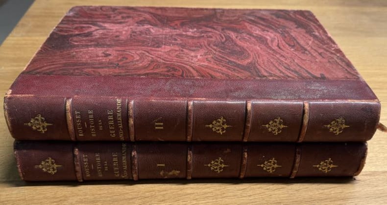 6 tomes en 6 volumes in 8 demi chagrin marron à nerfs, titre,tomaison dorés.double filet doré sur les plats, non rogné,tête dorée.Tome 1 L’armée impériale 1:faux-titre, titre,VIII,429 pages,6 cartes sur doble page montées sur onglets.Tome 2 L’armée impériale 2:Faux-titre,titre,528 pages, 5cartes sur double page montées sur onglets.Tome 3 : le siège de Paris Faux-titre, titre, 442 pages,5 cartes sur double page ou dépliantes,montées sur onglets.Tomes 4:Les armées de Province 1 faux-titre,titre,432 pages,5cartes montées sur onglets.Tome 5:les armées de Province 2:faux-titre, titre,362 pages,3 cartes sur double page montées sur onglets.1 plan dans le texte.tome 6 Les armées de Province 3 faux-titre,titre,372 pages,8 cartes sur double page ou dépliantes, montées sur onglets.Montgrédien & Cie librairie illustrée sans date(1894) très bon état