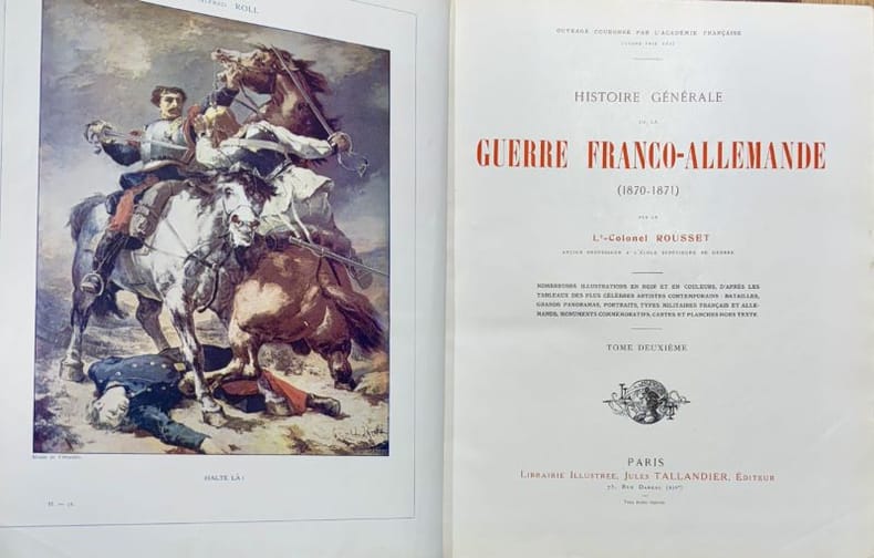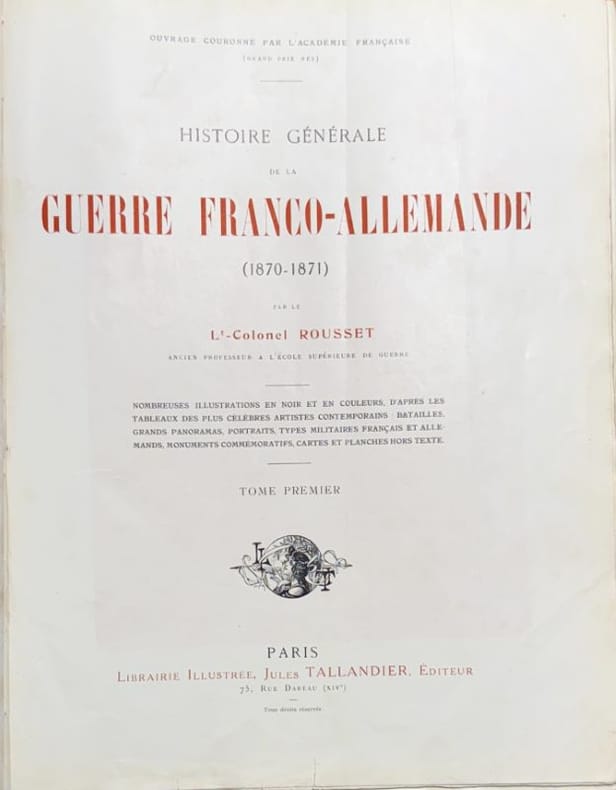 Bon exemplaire, bien complet de l'Atlas de 56 cartes à double page, montées sur onglet.- Tome Ier : L'Armée Impériale, 1ère partie ; VIII-429 pages. - Tome deuxième : L'Armée Impériale, 2e partie ; 528 pages. - Tome troisième : Le Siège de Paris ; 444 pages. - Tome quatrième : Les Armées de Province, 1ère partie ; 432 pages. - Tome cinquième : Les Armées de Province, 2e partie ; 364 pages. - Tome sixième : Les Armées de Province, 3e partie ; 372 pages et VIII-38 pages d'Index alphabétique. - Tome septième : Atlas ; 56 cartes et 3 pages de table. PHOTOS sur DEMANDE. ...................... Photos sur demande ..........................