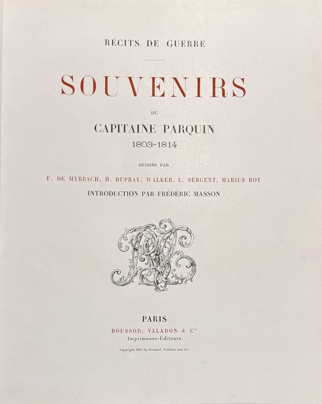 Recits de Guerre. Souvenirs du capitaine Parquin 1803-1814. In English (ask us if in doubt)/Recits de Guerre. Souvenirs du capitaine Parquin 1803-1814.The Memories of Captain Parguin. The Napoleonic Wars. F.De Myrbach H. Dupray Walker L. Sergent Marius Roy. Introduction by Frederic Masson. Paris. Boussod Valadon Cie. 1892. 168s.. SKUalbf8d3b3cc42d9338f.