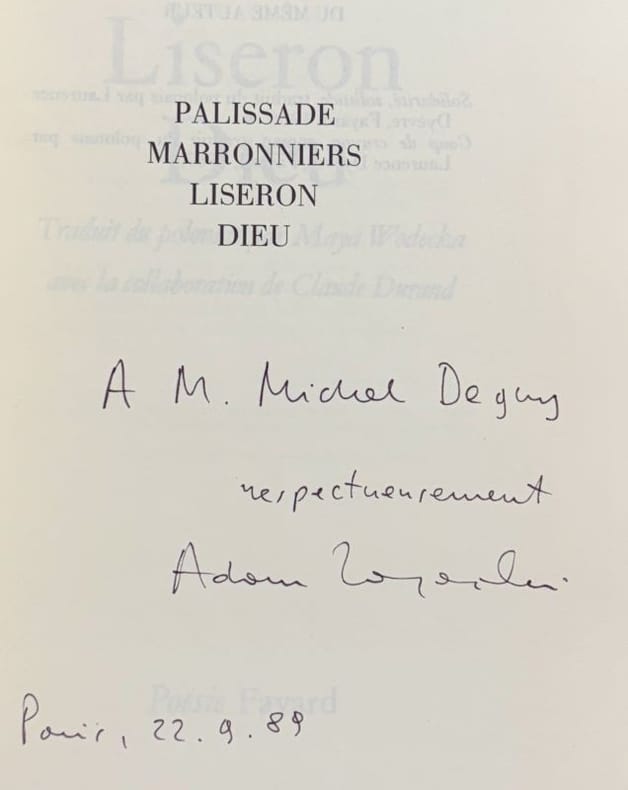 Paris Fayard, coll. "Poésie" 1989 1 vol. broché grand in-8, broché, couverture à rabats, 119 pp. Traduit du polonais par Maya Wodecka avec la collaboration de Claude Durand. Edition originale française à tirage limité. Envoi autographe signé de l'auteur à un poète et critique. Très bon état.