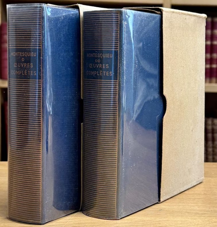 Paris Gallimard, coll. "Bibliothèque de la Pléiade" 1949-1951 2 vol. relié Tirages de 1949 et 1951. 2 vol. in-12, cuir souple de l'éditeur rhodoïds et étuis carton. Préface, vie de Montesquieu, bibliographie et notes par Roger Caillois. Manquent les jaquettes, sinon en bon état.Tome 1 : Discours et mémoires. Oeuvres académiques. Oeuvres littéraires. Portraits politiques. Voyages. Mes pensées, 1949 ; Tome 2 : Considérations sur les richesses de l'Espagne. Réflexions sur la monarchie universelle. Essai sur les causes qui peuvent affecter les esprits et les caractères. Considérations sur les causes de la grandeur des Romains et de leur décadence. De l'Esprit des lois. Défense de "l'Esprit des lois". Dernières oeuvres, 1951.