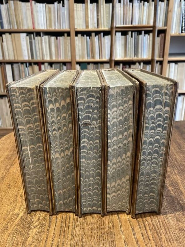 Paris Chez les libraires associés 1772 5 vol. reliés 5 vol. in-8, plein veau marbré, dos à nerfs ornés de pièces de titre et de tomaison en maroquin vert, caissons, fleurons et guirlandes dorés, triple filet d'encadrement sur les plats, tranches marbrées, CXVI + 431, 617, 540, 562 et CLVI + 378 pp. Exemplaire auquel manquent toutes les gravures hors-texte, ainsi que la page de titre du premier tome, et la vignette de titre gravée du second tome qui a été découpée. Pour le reste l'ouvrage est très bien relié à l'époque avec ex libris gravé du Chevalier du Mesnildot. En l'état.