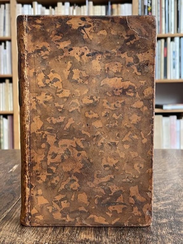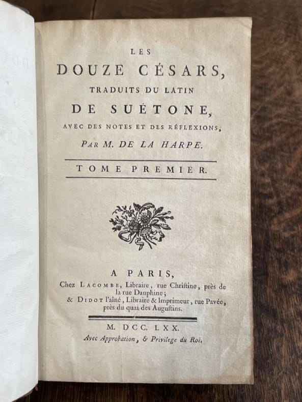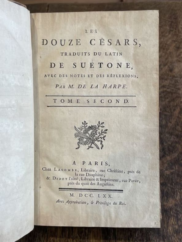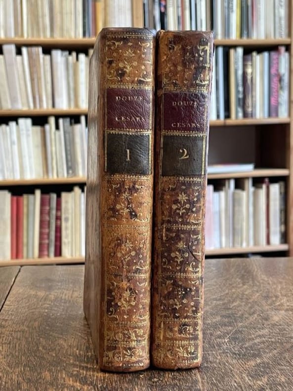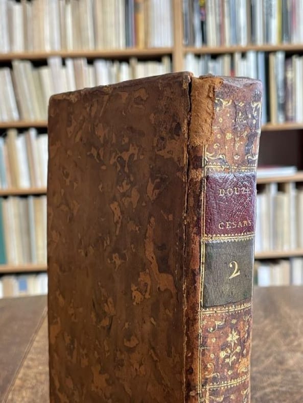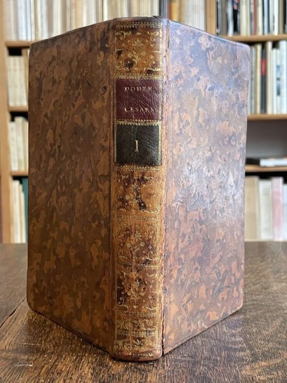 Paris Gabriel Warée, libraire 1805 Deux volumes in-8°, (4) 567 et 567 pp. Reliure de l'époque en plein veau blond, dos lisse richement orné, pièces de titre et de tomaison en maroquin rouge, palettes et caissons dorés, triple filet sur les plats, roulette sur les coupes, tranches et gardes marbrées. (volumes légèrement frottés, présence de pâles rousseurs et de faibles brunissures dans l'ensemble, cerne claire en marge du portrait de Suétone). Edition ornée de 13 beaux portraits gravés en hors-texte d'après MARADAN. De l'imprimerie de Guilleminet. Tome I : Jules César - Auguste - Tibère; Tome II : Caligula - Claude - Néron - Galba - Othon - Vitellius - Vespasien - Titus - Domitien. Bel exemplaire.
