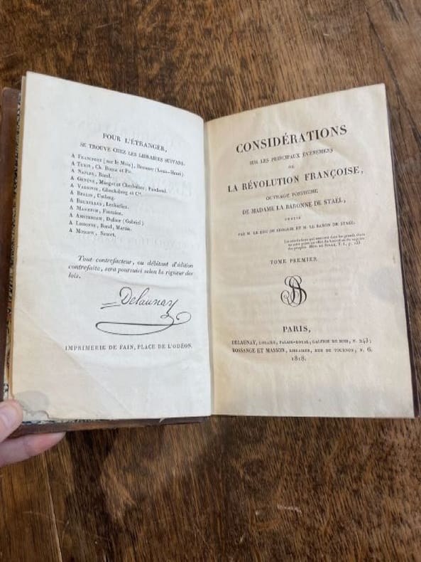 Seconde édition.À la Restauration, Madame de Staël (1766-1817), se fixa définitivement en France. La fin de sa vie sera occupée à la rédaction de cet ouvrage de synthèse et de réflexion. Fidèle à elle-même, elle clôt le livre par un appel à la liberté. Ces Considérations ouvrent une voie, celle du romantisme actif qui s'oppose à celui des regrets et de la nostalgie : la perfectibilité de la société, thème éternel, y est inlassablement affirmée.Vicaire, VII, 654. - - VENTE PAR CORRESPONDANCE UNIQUEMENT