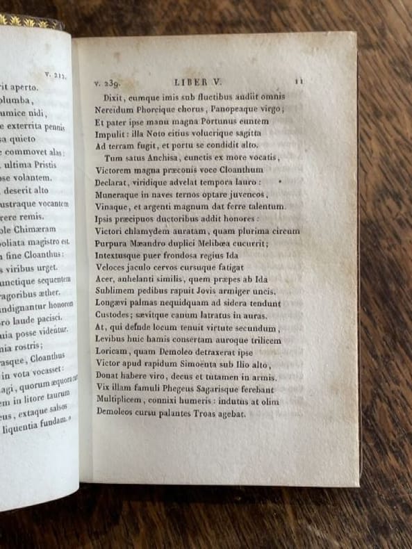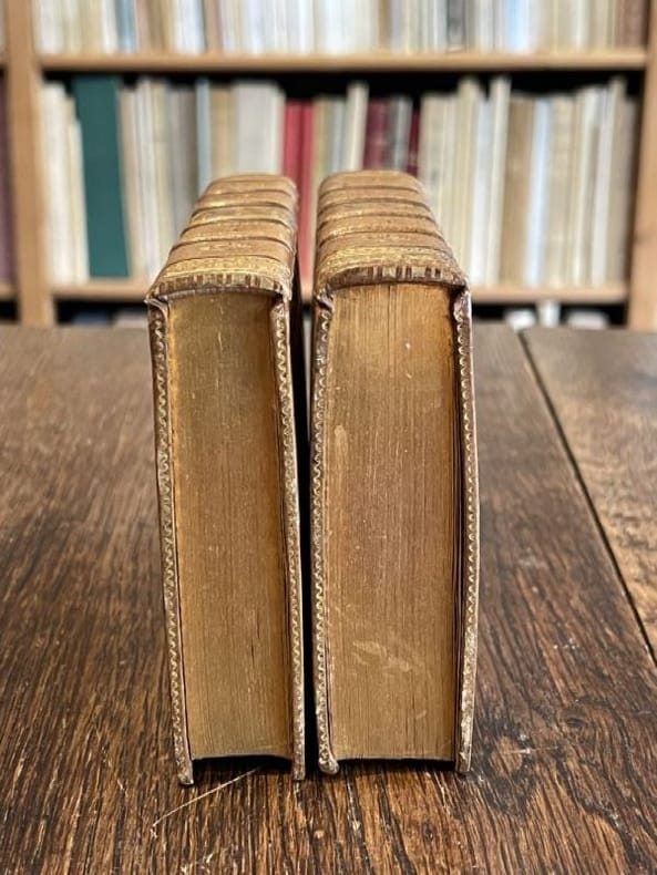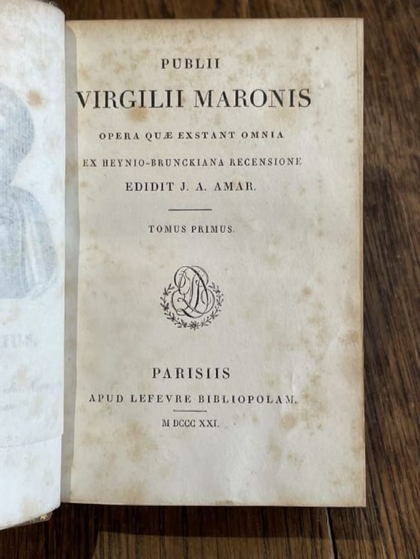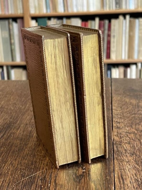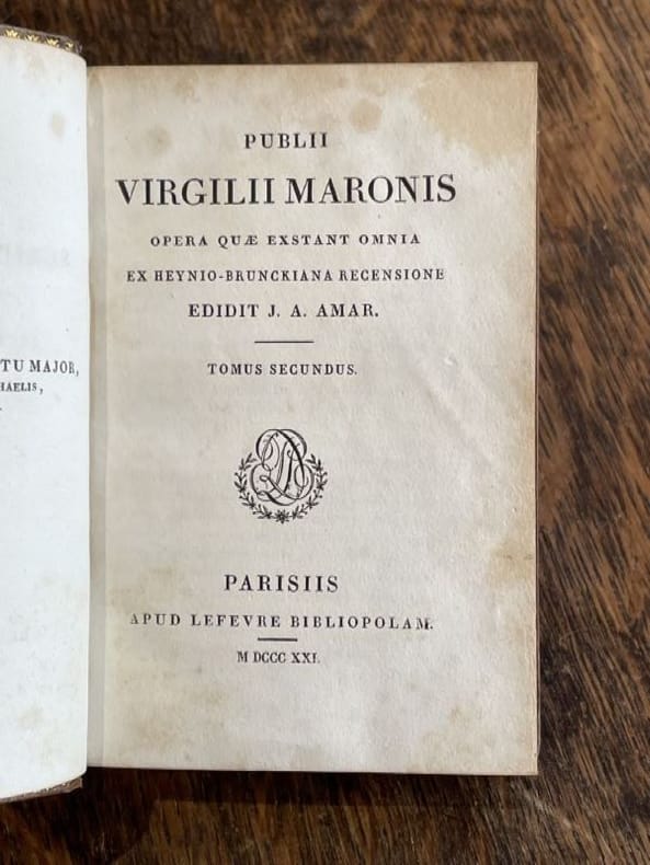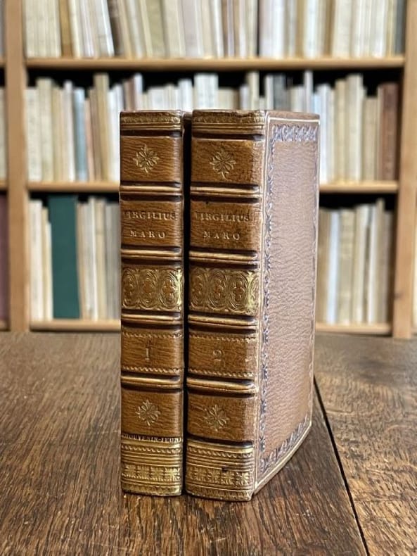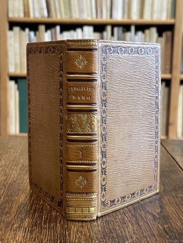 Paris Lefèvre 1821 2 vol. reliés 2 vol. in-24, plein cuir de Russie brun, dos à nerfs ornés de filets, guirlandes et fleurons dorés et à froid, filet doré et guirlande à froid en encadrement des plats, coiffes guillochées, coupes filetées, guirlandes intérieures dorées, tranches dorées (Thouvenin jeune), XX + 247 et 326 pp., portrait-frontispice. Édition latine contenant les Bucoliques, les Géorgiques, et l'Énéide de Virgile publiée par le philologue Jean-Antoine Amar sur la base de la recension critique de Heyne et Brunck. Impression de Didot, en belle condition dans sa jolie reliure d'époque signée.