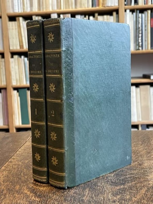 Jean de La Bruyère, Les Caractères de La Bruyère suivis des Caractères de Théophraste, traduits du grec par le même. Paris, Aimé André [imprimerie de Jules Didot ainé], 1829. 2 volumes in-8, front.-[4]-432p & [4]-408p. Très bel exemplaire sur grand papier vélin, non annoncé. Cette édition avait été publié une première fois en 1824 par Lefèvre et était alors vendue 8 à 12 francs. Les exemplaires du premier tirage en « Jésus vélin » étaient vendus 42 francs. Elle a été ici réimprimée par Aimé André (voir Brunet, III, 7). Le portrait est d'ailleurs gravé par Taurel en 1824. Cet ouvrage forme les premiers volumes de la fameuse Collection des Classiques françois. Elle avait été publiée entre 1824 et 1828. Reliure signée Thivet, demi-maroquin rouge, dos à nerfs bien décoré, filet en bordure, tête dorée, non rogné. Un coup en bordure du plat supérieur de chacun des deux volumes (au niveau du cuir). Papier d'une très grande fraicheur. Ouvrage magnifiquement imprimé.