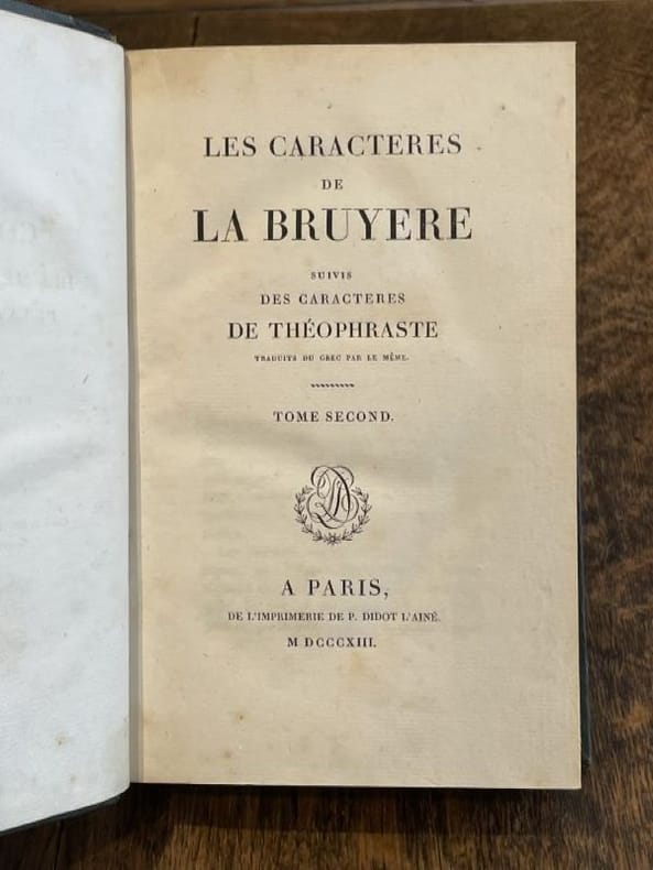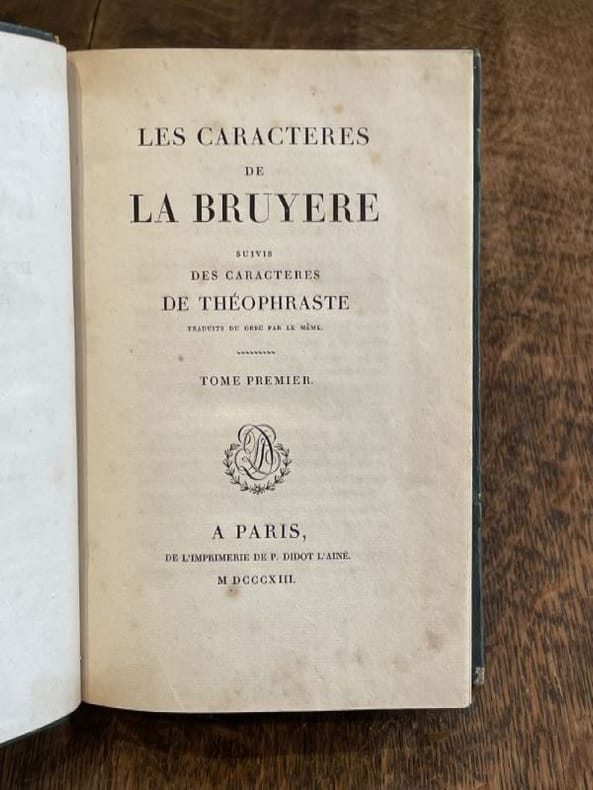 Les Caractères de La Bruyère suivis des Caractères de Théophraste, traduits du grec par le même; précédés d'une notice sur La Bruyère considéré comme écrivain et moraliste par J. Simonnin. (Paris: Emler frères, 1829). [M.C.: Littérature]