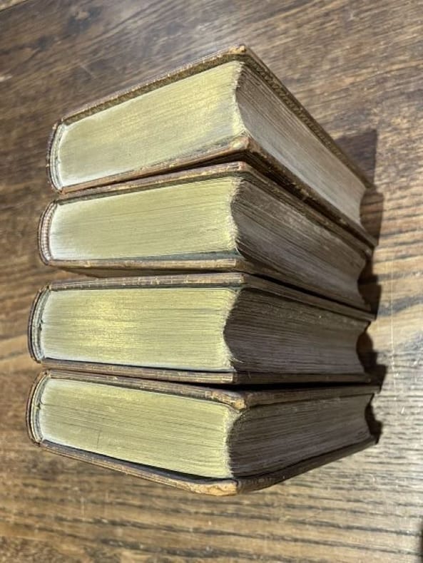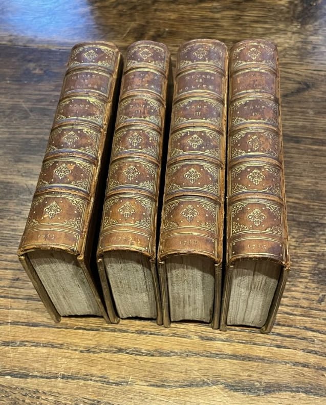 Utrecht Guillaume van de Water 1713 4 vol. reliés 4 vol. in-24, plein veau brun, dos à nerfs ornés de caissons, fleurons et filets d'encadrement dorés, triple filet d'encadrement doré sur les plats, têtes dorées, roulette intérieure dorée, coupes filetées, non rognés, 137 + 448, 504, 538 et 485 pp. Edition ornée de 33 planches gravées par G. Schouten dont un portrait-frontsipice. Reliure signée du XIXe siècle frottée aux dos avec les mors usés.