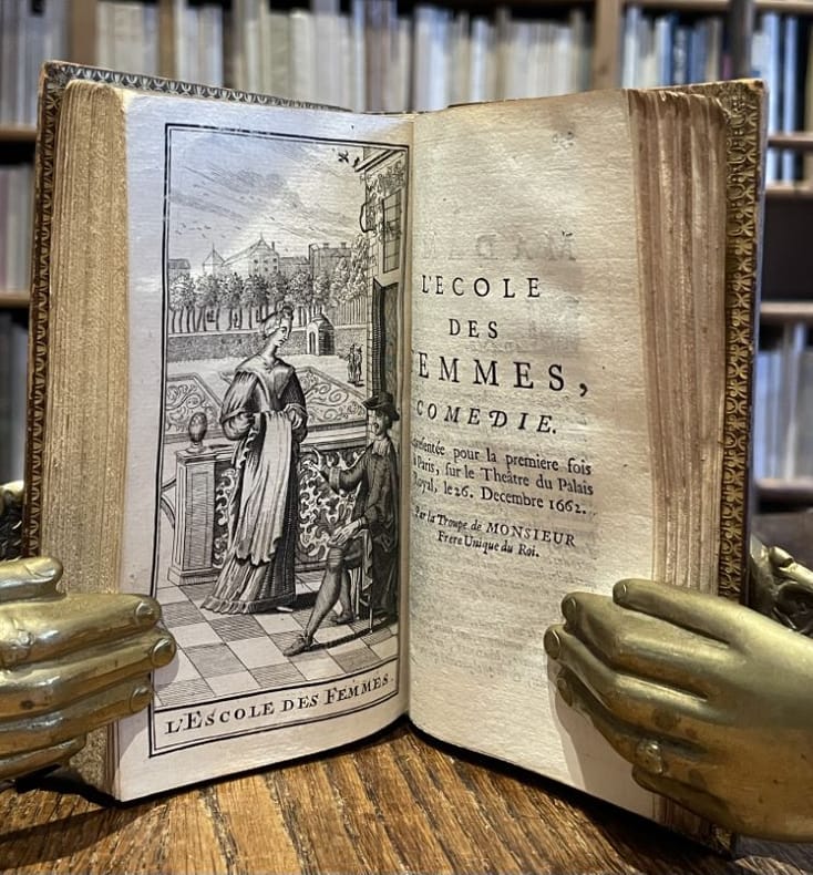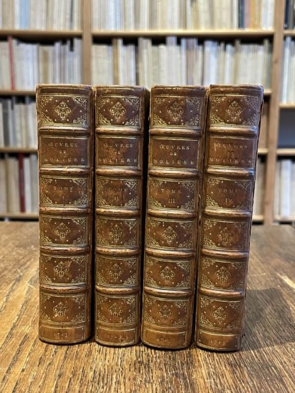 Nouvelle édition. La première édition collective complète date de 1682. Cette édition de 1709-1710 montre les personnages avec des costumes accomodés à la mode de la fin du règne de Louis XIV. On échappe au ridicule anachronique des costumes Louis XV des éditions qui suivront à partir de 1734. L'édition de 1718 montrera des acteurs en costumes retouchés pour suivre la mode de la Régence. Le premier volume contient un Avis sur cette nouvelle édition, la table générale des oeuvres contenues dans les huit volumes, la Préface, la Vie de Mr de Molière par Grimarest suivie de la Lettre critique écrite à M *** sur le livre intitulé La Vie de M. de Molière, avec une addition à la Vie de Molière, suit les pièces suivantes : L'Estourdy ou les Contre-Temps, comédie ; Le Dépit amoureux, comédie. Le deuxième volume contient les pièces suivantes : Les Précieuses ridicules, comédi ; Sganarelle ou le Cocu imaginaire, comédie ; L'Escole des Maris, comédie ; Les Fascheux, comédie ; L'Escole des Femmes, comédie, et la Critique de l'Escole des Femmes. Le troisième volume contient les pièces suivantes : Les Plaisirs de l'Isle Enchantée, festes galantes et magnifiques faites par le Roi à Versailles le 7 mai 1664, avec la Princesse d'Elide, comédie galante ; le Mariage forcé, comédie ; L'Amour Médecin, comédie ; le Misantrope, comédie ; le Médecin malgré lui, comédie. Le quatrième volume contient les pièces suivantes : Le Sicilien ou l'Amour peintre, comédie ; Amphiytryon, comédie, ; L'Avare, comédie ; George Dandin ou le Mari confondu, comédie. Le cinquième volume contient les pièces suivantes : Tartuffe ou l'Imposteur, comédie, avec la Préface et trois placets au roi, au sujet de cette comédie ; Monsieur de Pourceaugnac, comédie-ballet ; Le Bourgeois Gentilhomme, comédie-ballet. Le sixième volume contient les pièces suivantes : Les Fourberies de Scapin, comédie ; Psyché, tragédie-ballet ; Les Femmes savantes, comédie. Le septième volume contient les pièces suivantes : Dom Garcie de Navarre ou le Prince jaloux, comédie ; L'Impromptu de Versailles, comédie ; Dom Juan ou le Fertin de Pierre, comédie ; Mélicerte, comédie pastorale héroïque ; Les Amants magnifiques, comédie-ballet. Le huitième et dernier volume contient les pièces suivantes : La Comtesse d'Escarbagnas, comédie ; Le Malade imaginaire, comédie ; L'Ombre de Molière, comédie (qui n'est pas de Molière mais de Brécourt, acteur de la troupe de Molière) ; Extraits de divers auteurs sur Molière ; Recueil des épigrammes et épitaphes par divers auteurs sur Monsieur de Molière. L'ensemble des huit volume a été imprimé par Denys II Thierry, célèbre imprimeur de Molière dès le dernier quart du XVIIe siècle, également imprimeur des ouvrages de La Fontaine et d'autres parmi les grands auteurs du Grand Siècle. Il est intéressant de noter que le premier volume porte la date de 1709 à à l'achevé d'imprimer. Le deuxième volume ne porte pas de date d'impression (sans aucun doute également 1709). Le troisième, quatrième et cinquième volume portent encore la date d'impression de 1709. Le sixième volume ne porte pas de date d'impression (sans doute a-t-il été imprimé au tout début de 1710 ou à la fin de 1709. Les septième et huitième volumes portent la date d'impression de 1710. Le privilège du 5 novembre 1708 a été obtenu par le libraire Michel David mais l'édition a été partagée entre plusieurs libraires, à savoir : Guignard, Aubouyn, Cavelier, Charpentier, Osmont, Rbou, Clousier, Trabouillet. On trouve donc des exemplaires avec différents noms de libraires sur les titres. Les huit volumes de notre exemplaire portent le nom de Trabouillet. Inutile de revenir sur le génie de Molière et son importance dans l'histoire littéraire universelle. Nous pensons que cette série ne porte aucune signature de relieur à la demande du bibliophile anonyme qui n'a pas même voulu laisser son identité dans les volumes. Exemplaire vierge de toute provenance. Magnifique exemplaire parfaitement établi dans le goût et la qualité des meilleurs relieurs de la seconde moitié du XIXe siècle, mais très probablement due au talent de Roger Devauchelle dont nous reconnaissons quelques indices de savoir faire. Une très très belle pièce de bibliophilie prête pour traverser sans frémir tout le XXIe siècle.