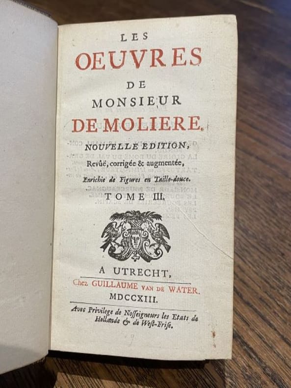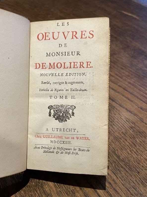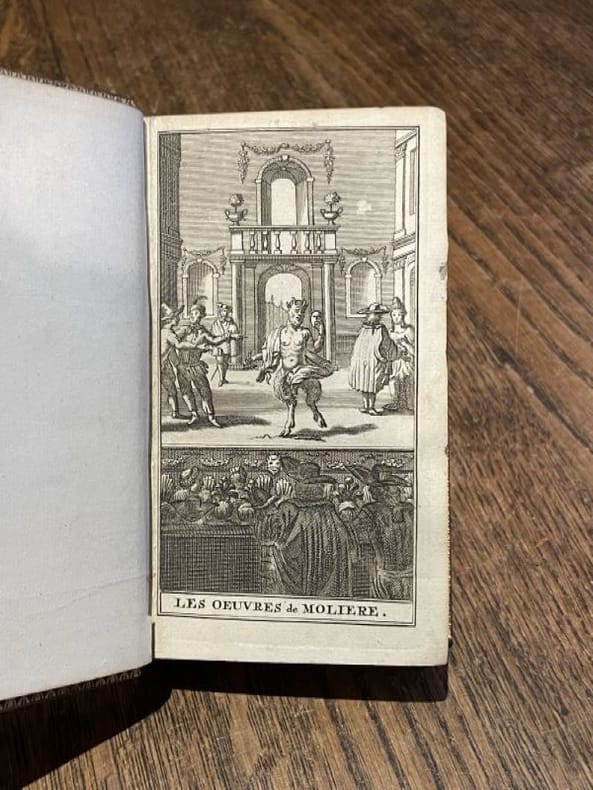 Paris Jérôme Traboüillet/ Imp. Denys Thierry, 1710, in-12 (10x16cm), pleine basane du temps, (14ff), 353p., 4 gravures dont un portrait de Molière. Ce premier volume contient un Avis sur cette nouvelle édition, la Table générale des oeuvres contenues dans les huit volumes, la Préface, la Vie de Mr de Molière par Grimarest, La Critique de La Vie de M. de Molière, une addition à la Vie de Molière ou réponse à la Critique par Monsieur de Grimarest. Traces du temps sur la reliure.