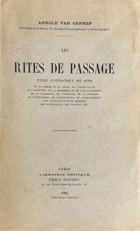 Paris Emile Nourry 1909 1 vol. broché in-8, broché, II + 288 pp. Edition originale rare. Rites de la porte et du seuil, de l'hospitalité, de l'adoption, de la grossesse et de l'accouchement, de la naissance, de l'enfance, de la puberté, de l'initiation, de l'ordination, du couronnement, des fiançailles et du mariage, des funérailles, des saisons, etc. Dos ridé et couverture un peu défraîchie.