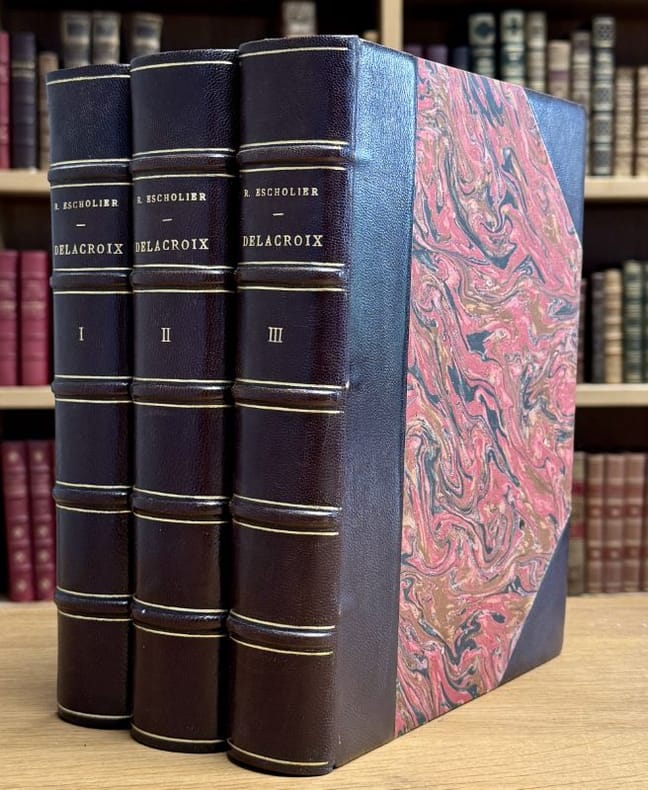 Paris H. Floury, coll. "La vie et l'art romantiques" 1926 3 vol. relié 3 vol. in-4, demi-chagrin brun à coins, dos à nerfs soulignés de filets dorés, têtes dorées, couvertures et dos conservés, 296, 339 et 295 pp., très nombreuses illustrations en noir et en couleurs reproduites par Daniel Jacomet. Edition originale à tirage numéroté (après 200 Arches). Bel exemplaire, bien relié.